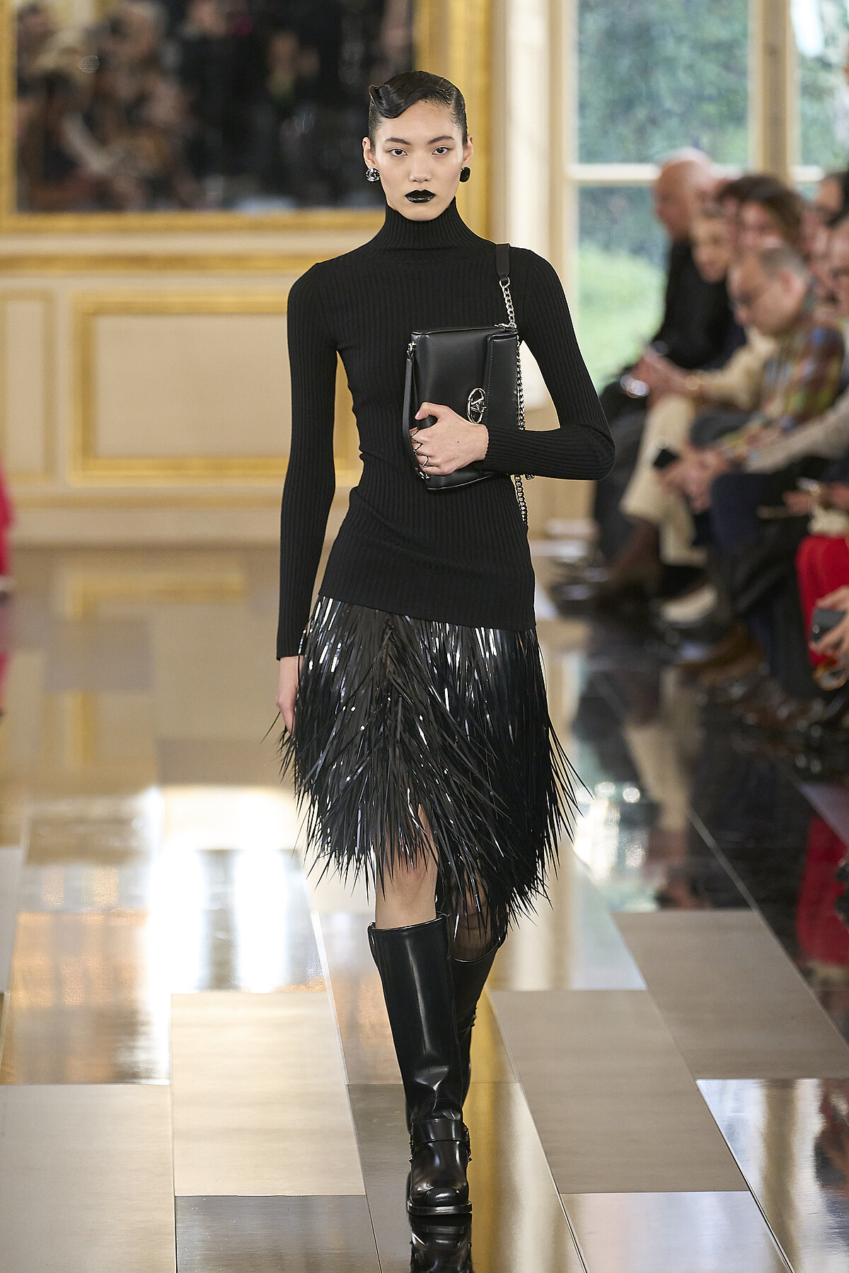 Valentino 2024年秋季時裝秀,Pierpaolo Piccioli 一改過去幾季鮮明的大膽明亮色彩,先透過一張印有黑色信封蠟章的啞光黑邀請卡,預告大秀將以 Valentino Le Noir 為題,以單一色調力量探究黑色的無限可能,讓黑色不僅僅是一種顏色。從黑色禮服、黑色西裝,甚至是每位模特兒臉部的光澤唇膏,一切都是黑色的,這是Pierpaolo Piccioli 對於臻美工藝的探索,經過提煉後呈現為具象之美理念,如今看起來,更像是告別合作25年的時裝屋及團隊的前奏。