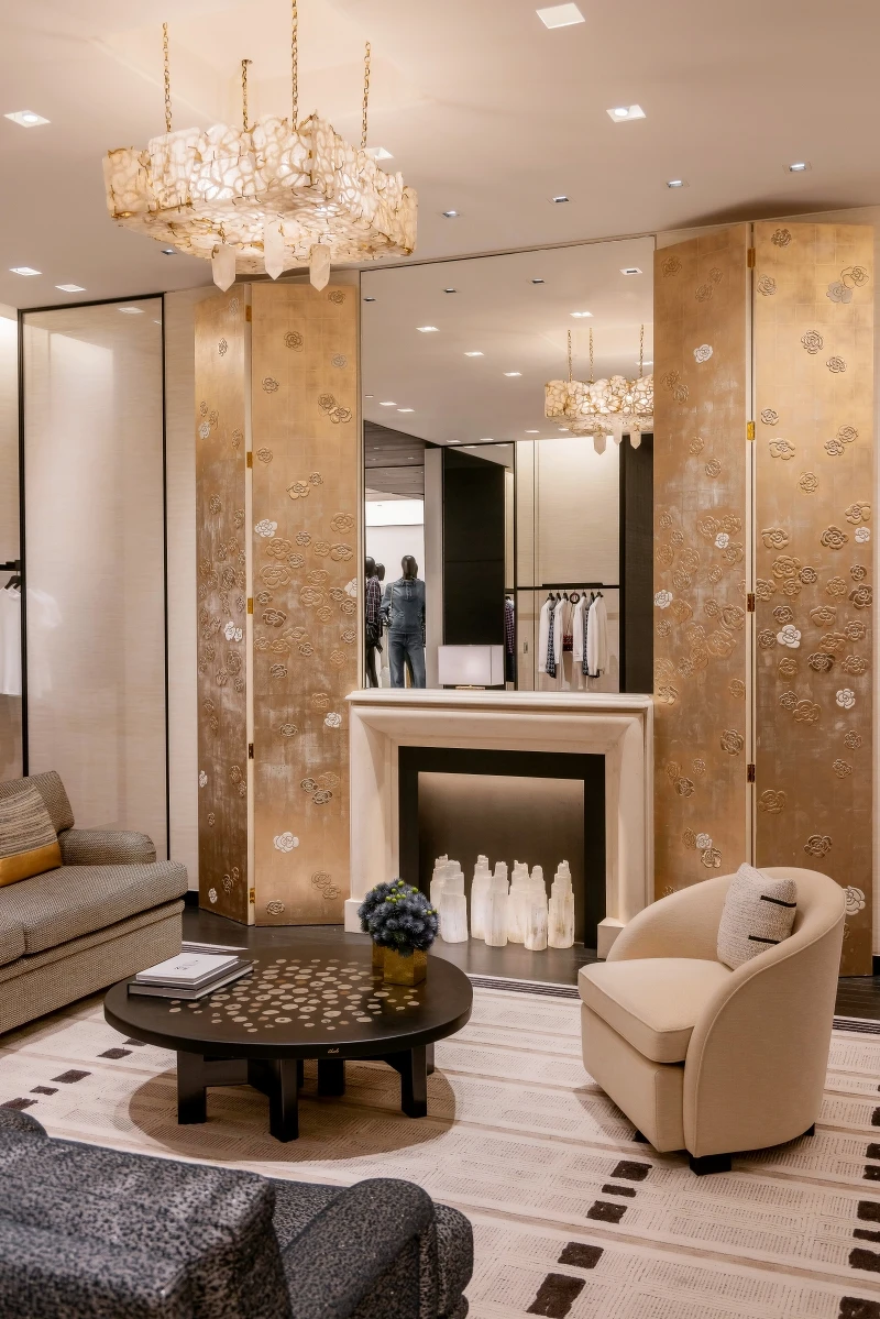 在二樓的設計上,Peter Marino幾乎是重現了香奈兒女士位在康朋街的公寓元素,多座斜紋軟呢、米色系搭配菱格紋的沙發,都是香奈兒女士鍾愛的款式,同時這個空間也更熱烈的為香奈兒女士熱愛藝術、支持藝術的精神表態,包括由Goossens金銀工坊的金匠所設計的水晶吊燈、Nancy Lorenz打造具有東方文化的金色山茶花漆器屏風、雕塑家Johan Creten的釉面陶製邊桌與Ado Chale鑲嵌白鐵礦的咖啡桌等藝術擺件點綴於各個空間中!