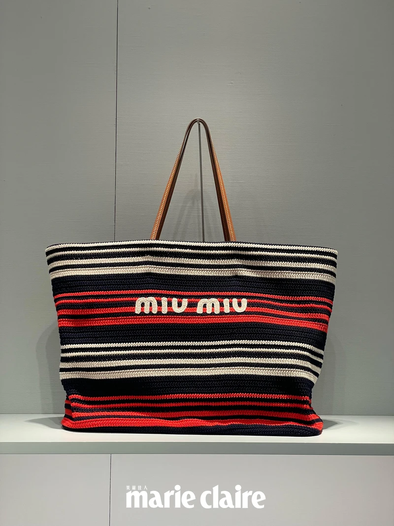 為慶祝開幕,Miu Miu高雄漢神巨蛋專門店搶先上市一款黑、紅交織的拼色鉤織手提袋,鮮豔條紋扣合復古韻味;另一款黑、黃與米色搭配的條紋IVY帆布托特包,則是全台獨賣款式,2款手袋皆是輕盈與實用的首選,活潑亮麗外型特別適合夏日與海灘!
