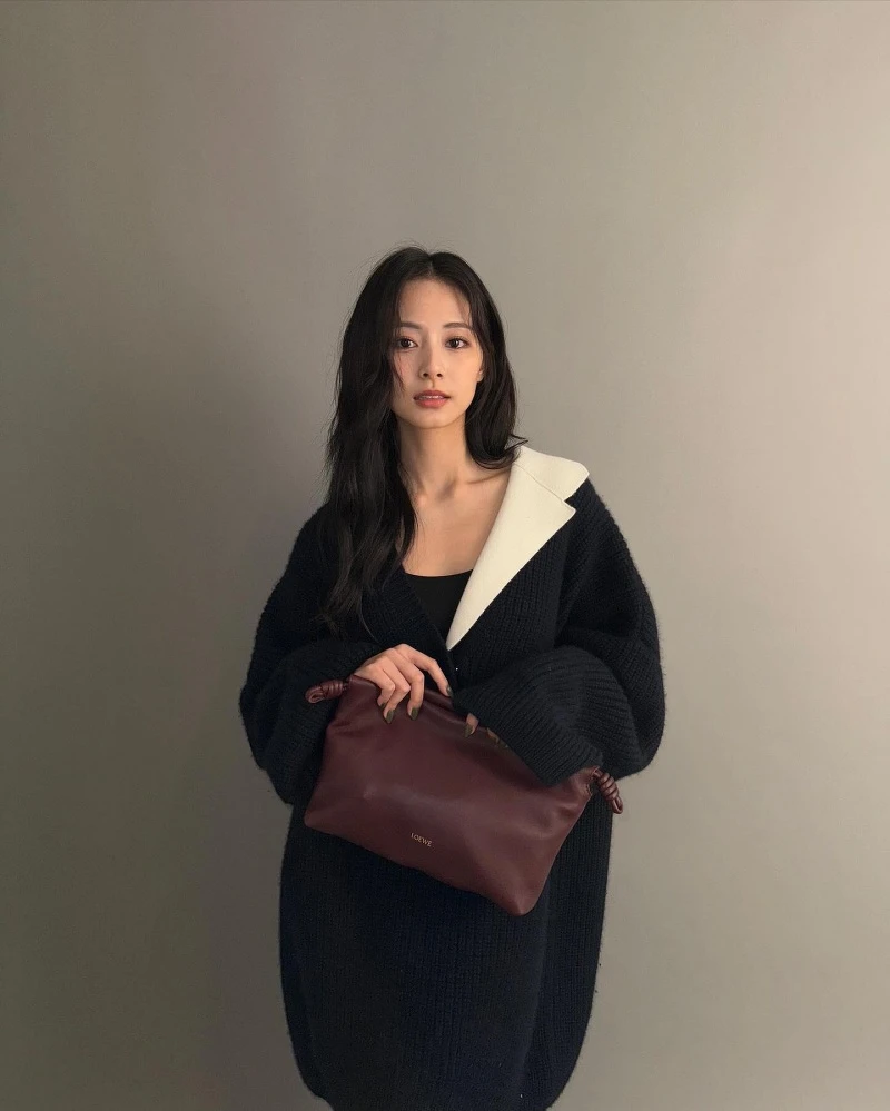 成熟優雅的風格也好好看!子瑜以微捲的髮型搭配上寬鬆的大衣外套,搭配上手拿包,呈現出不同於平常的典雅氣質。