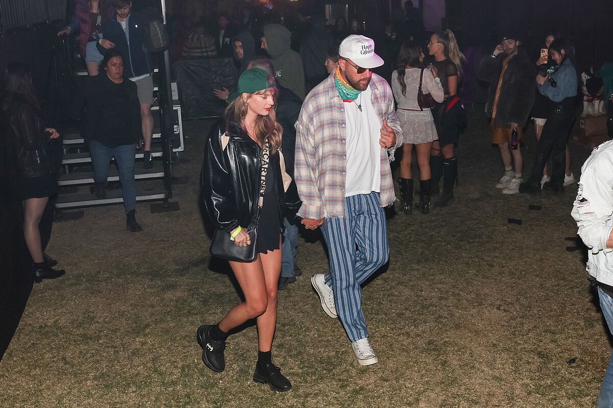 泰勒絲與男友一起來到科切拉享受音樂盛會、行動支持她的圈內好友們,這對情侶戴著鴨舌帽,雙雙以低調休閒的打扮混在人群之中。泰勒絲在黑色短裙、皮衣外背上Stella McCartney的肩背包,腳下為Gucci的老爹球鞋,唱唱跳跳一整天才不會累。