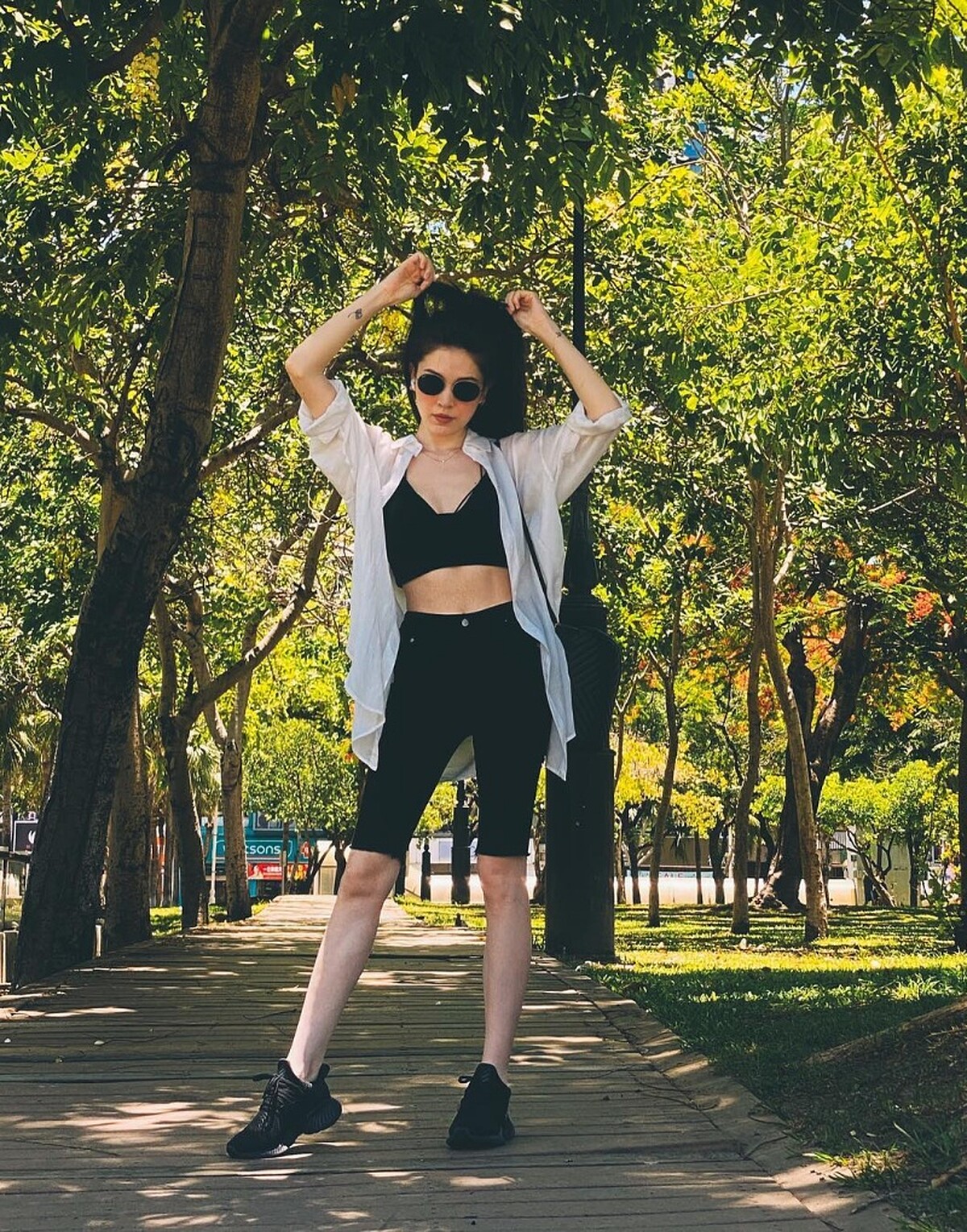 想要輕鬆的完成休閒時尚造型可以參考許瑋甯黑白撞色的搭配,短版的黑色背心搭配上5分褲 ,搭配上一件寬鬆襯衫當罩衫,技能防曬又能讓休閒造型加分。