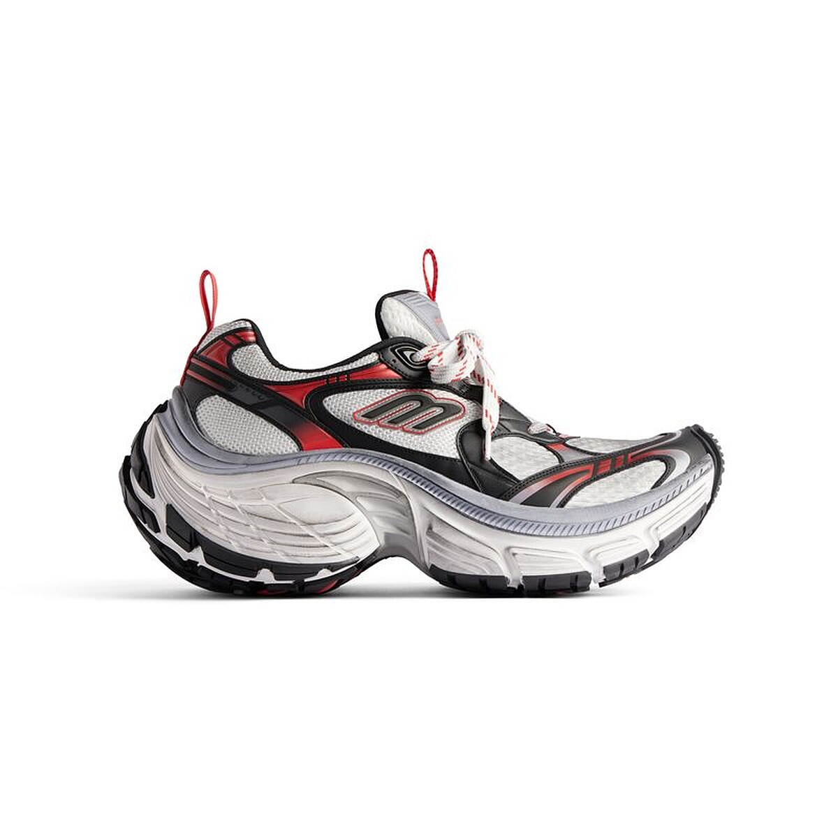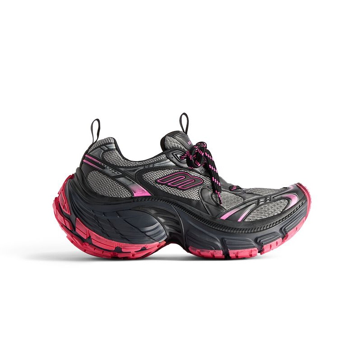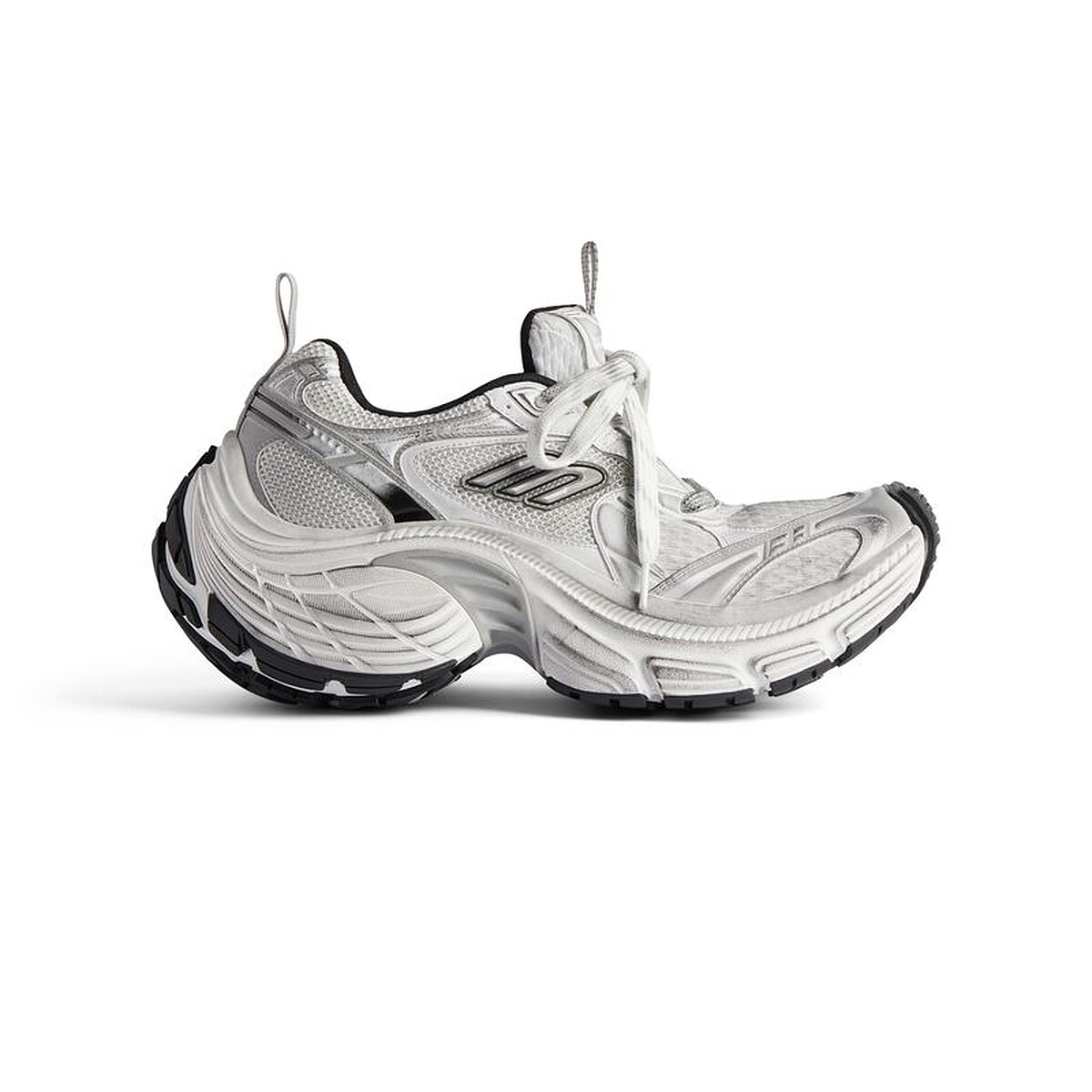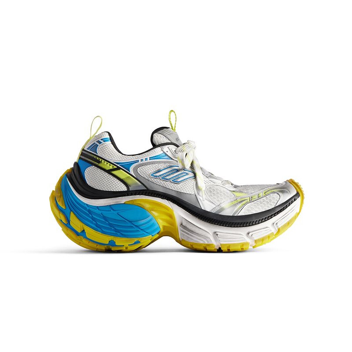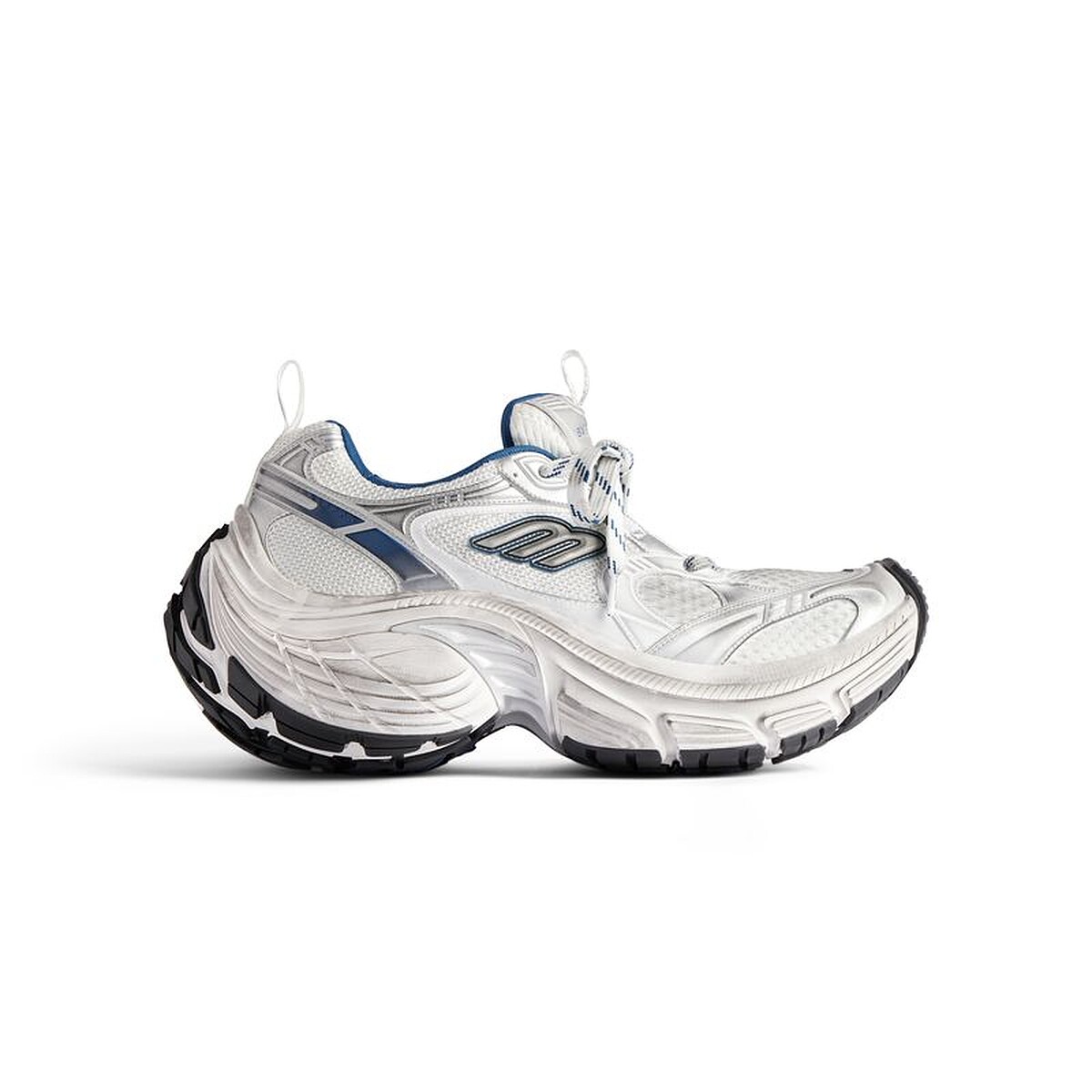 10XL運動鞋以健身房訓練鞋為原型,並將整體輪廓極限放大,強化與運動員身份的關聯性,並再次展現創意總監Demna對誇張輪廓的著迷,復古網布球鞋的外觀上,以歪斜的B Logo點綴,呈現一種加速奔跑時的模樣,寬大的鞋底有著圓潤的線條,鞋頭與鞋跟皆向上微翹,從正面即可看見鞋底的撞色設計,任何細節都在想辦法抓住你的眼球。