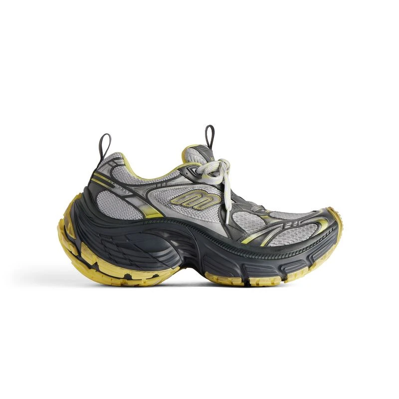 10XL運動鞋以健身房訓練鞋為原型,並將整體輪廓極限放大,強化與運動員身份的關聯性,並再次展現創意總監Demna對誇張輪廓的著迷,復古網布球鞋的外觀上,以歪斜的B Logo點綴,呈現一種加速奔跑時的模樣,寬大的鞋底有著圓潤的線條,鞋頭與鞋跟皆向上微翹,從正面即可看見鞋底的撞色設計,任何細節都在想辦法抓住你的眼球。