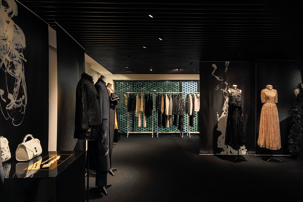 在本季大篇幅墨色服裝所帶來的感官震撼,也透過不同工藝技法表現出力道猶存的刷墨層次,運用著黑流蘇金屬緹花大衣、全手工刺繡圖騰長大衣、拼接金屬筆刷鱗片羊皮玉鐲包,表現著堆墨、焦墨、流墨的靜謐張力。2024/25秋冬系列,就好像一首帶有前衛銳意的文人頌詞,一撇一捺間,敘事出墨之於文化的象徵、柔韌的滲透性與渲染力,洋溢著夏姿新一季更為俐落、個性的可能。