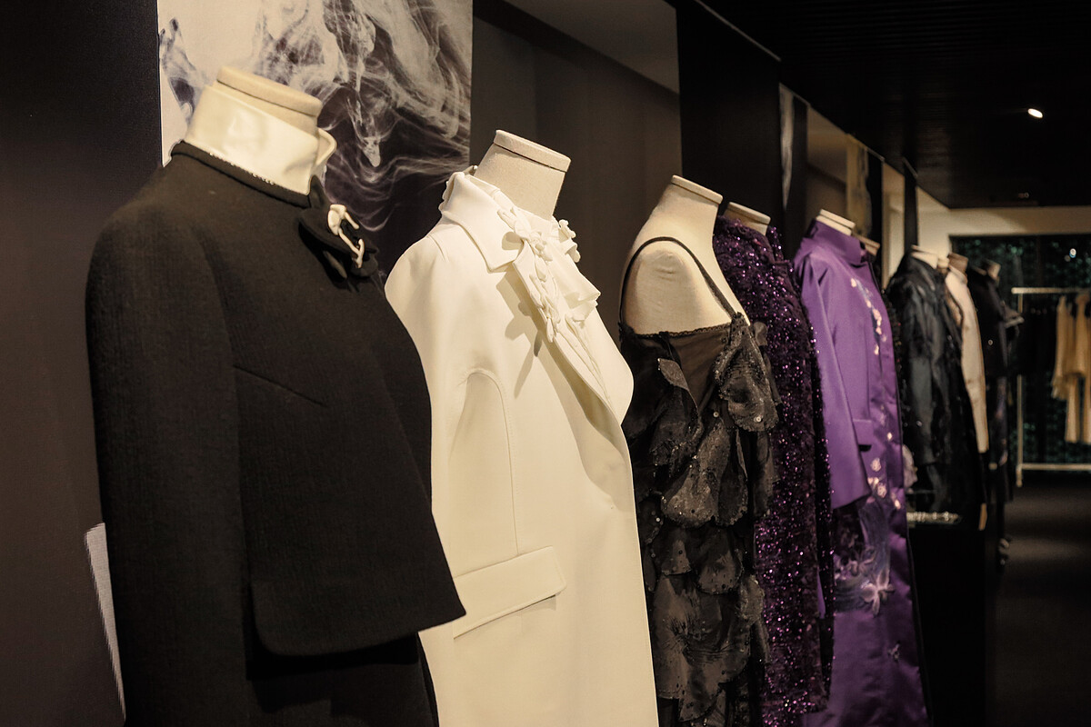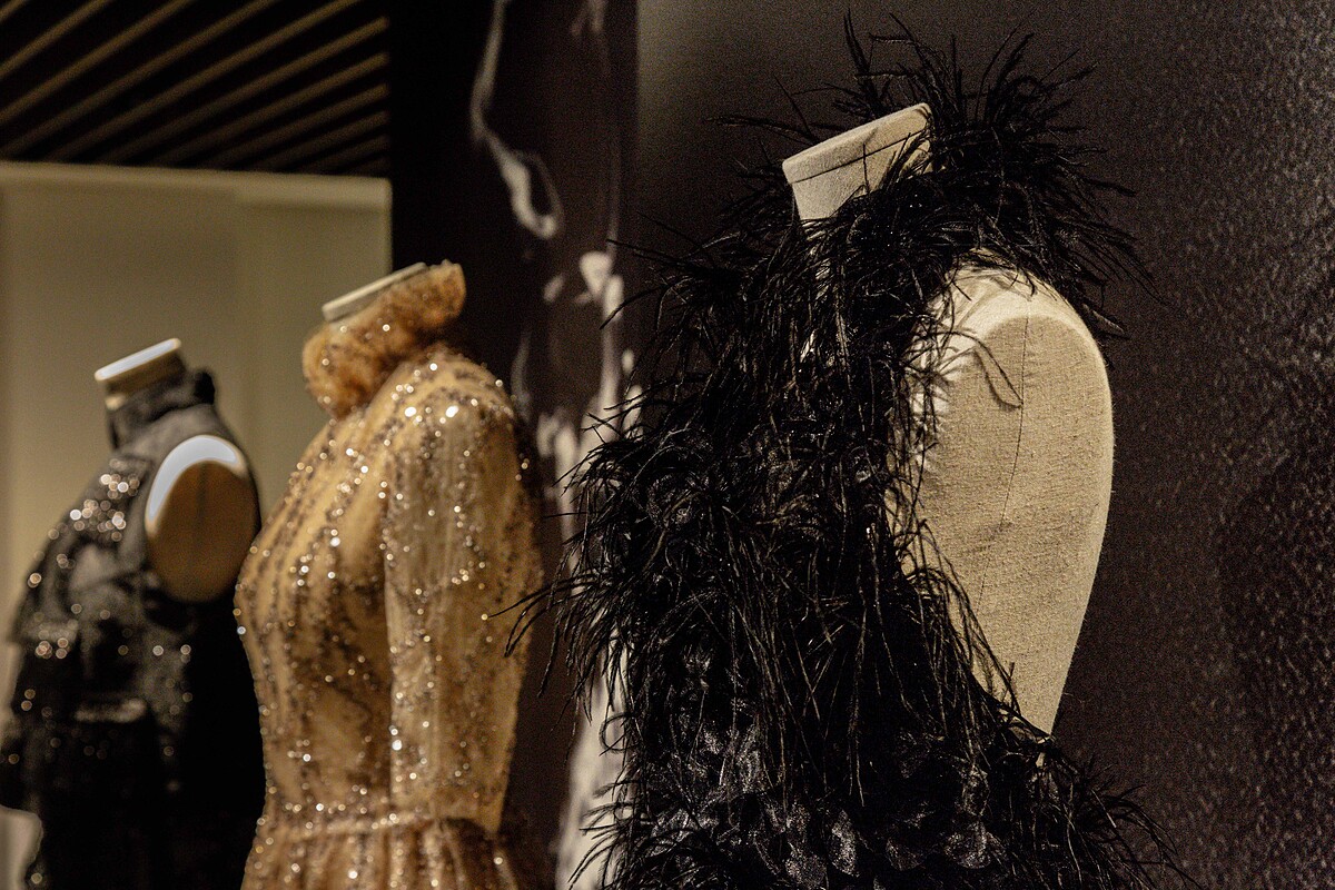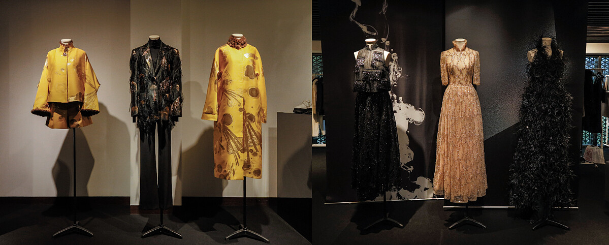 而借鑿著本季靈感「墨條」長立方形體輪廓,呼應著60年代西式套裝剪裁,「套裝」成為本季關鍵性搭配,推出經典黑白雙色手工蘭花裝飾立領套裝、銘黃色金屬緹花貂毛飾邊套裝、黑戧金金蔥緹花系裝外套套裝,致敬著六零年代那革命性、顛覆傳統的意識精神,而在考量實穿性與文化藝術平衡之間,透過西式毛料、講究著中式作法,雙雙推出同一概念、交叉中西對應版本,再展夏姿對於中西融合的熟稔技巧。