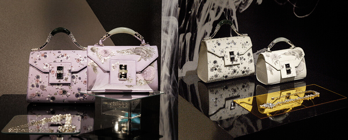 夏姿玉鐲包儼然已成為品牌經典代表包款,而致力將東方文化與時俱進的傳遞,向來為新中式優雅的核心,本季首次選用稀有的「和闐玉」玉種,細膩的質地、極高的韌性,與獨有溫潤柔和的油脂光澤,帶來更加年輕、優雅、輕盈的形象,配以法國山羊皮面,大面積繡上漸層淡紫色蘭花,也帶來當今流行的包款大小,象徵性宣告在流行趨勢的這道長河上,依然震盪出屬於東方獨一無二的風格型態。