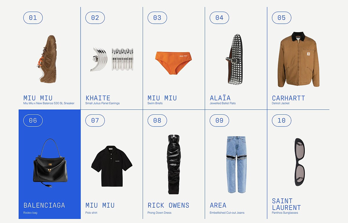 在2024 Q1最熱門單品TOP10榜單中,有3個名次都被Miu Miu給包辦了,分別是第一名的New Balance最新聯名530 SL運動鞋、第三名的彩色三角泳褲、第七名的Polo衫。