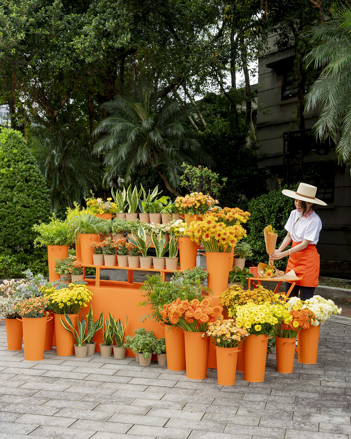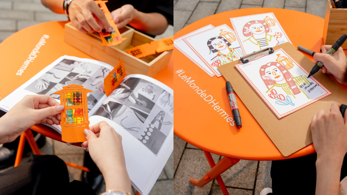 愛馬仕這回將松山文創園區-巴洛克花園改造為一座橘色小天地,現場除了可以在書報亭領取愛馬仕品牌雜誌,空間內還設置數個體驗區,並且不定時會有現場音樂演出及DJ表演。包括鮮花攤位、肖像速寫、套圈圈遊戲以及DIY手作書籤,每個角落都是美照產地!坐在特製的橘色桌椅上休息片刻,這景象彷彿穿越來到了巴黎。