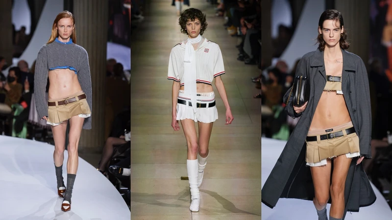 Miu Miu在2022年的春夏大秀上,讓模特兒穿上了超低腰迷你裙、極短的襯衫、毛衣走上伸展台,一系列原本學院感十足的單品在極小、極短化後,成了想來點叛逆在千金形象,當時其實收到正反不一的評論聲浪,不過在成功將Y2K的風潮帶回時尚圈後,至今已自成一派「Miu式穿搭」。