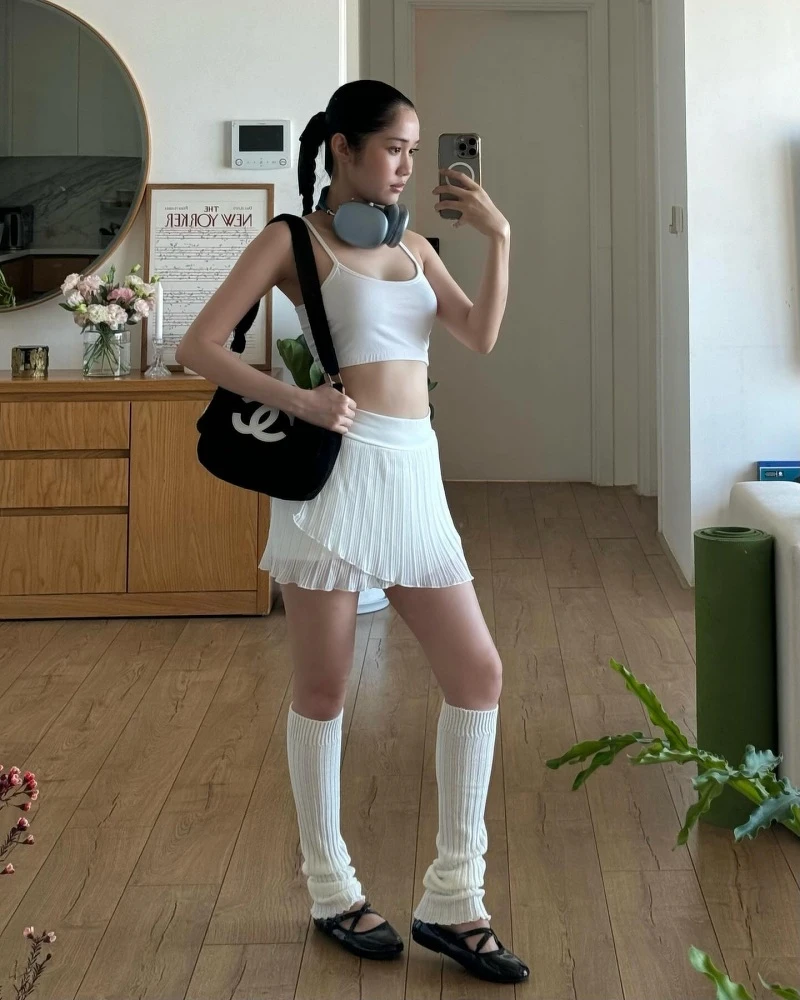 單品之間的衝突與反差感也是Miu系穿搭的必要特色,將寬鬆的運動球衣、大學T搭配迷你百褶裙、半筒襪或褲襪等,讓整體的穿搭帶點甜甜酷酷的感覺,視覺上的對比效果也很好。