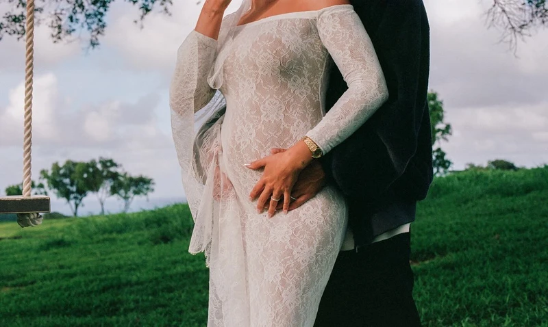 小賈斯汀與海莉兩人在2018年宣布結婚,當時的婚紗出自潮流精品品牌Off-White的設計師Virgil Abloh之手,在長長頭紗末端搭配上「TILL DEATH DO US PART」(直到死亡將我們分離)甜蜜誓言,而本回宣布懷孕消息時,也是穿上了一件合身的白色蕾絲長禮服。