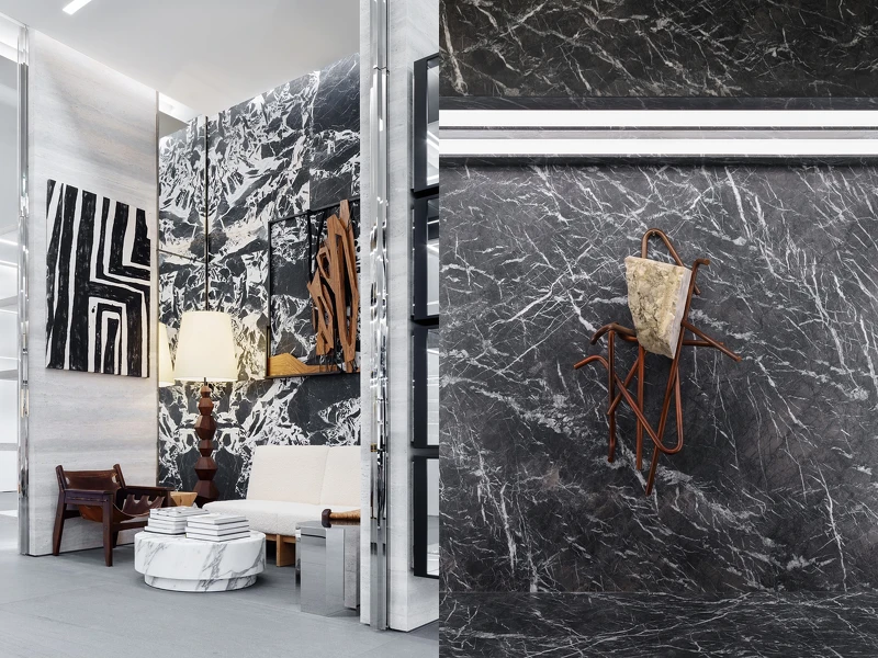 CELINE創意總監Hedi Slimane不只設計功力了得,才華洋溢的他也熱衷於攝影、音樂、建築與藝術,2019年起甚至親自構思位於世界各地的精品店建築與空間設計,最新CELINE精品店落腳台北101購物中心,偌大的空間佔地390平方米,以石灰華和大理石等高品質天然石材搭配,再加上橡木、黃銅、復古金色鏡面等暖色調相互輝映,地面則是鋪滿大片義大利巴薩崗石,牆面點綴大理石、 黑色飾漆、鏡面及鉻金屬,整體空間既有21世紀的粗獷主義建築美學的當代感,亦不失精緻且優雅的迷人氛圍,美得令人驚豔。
