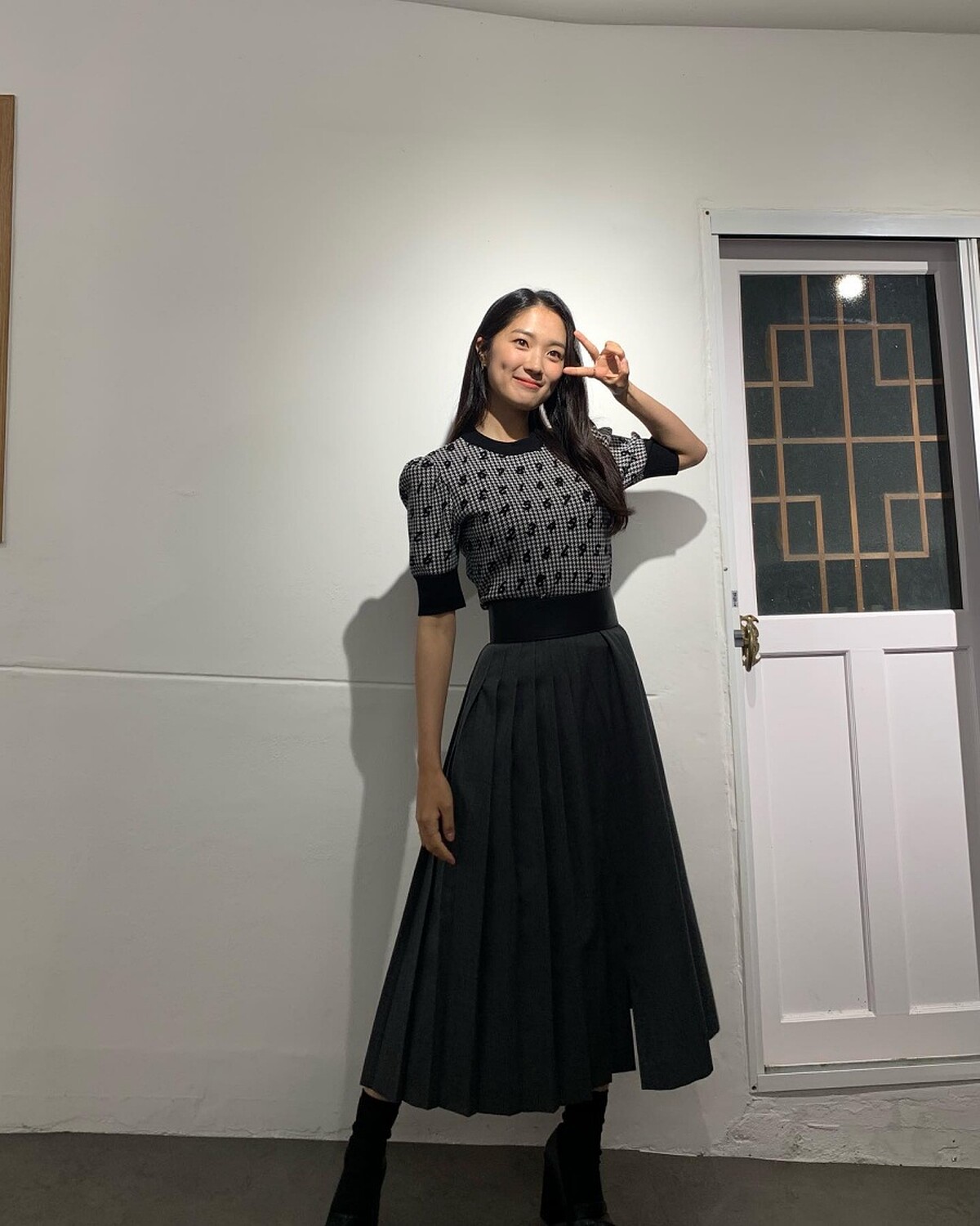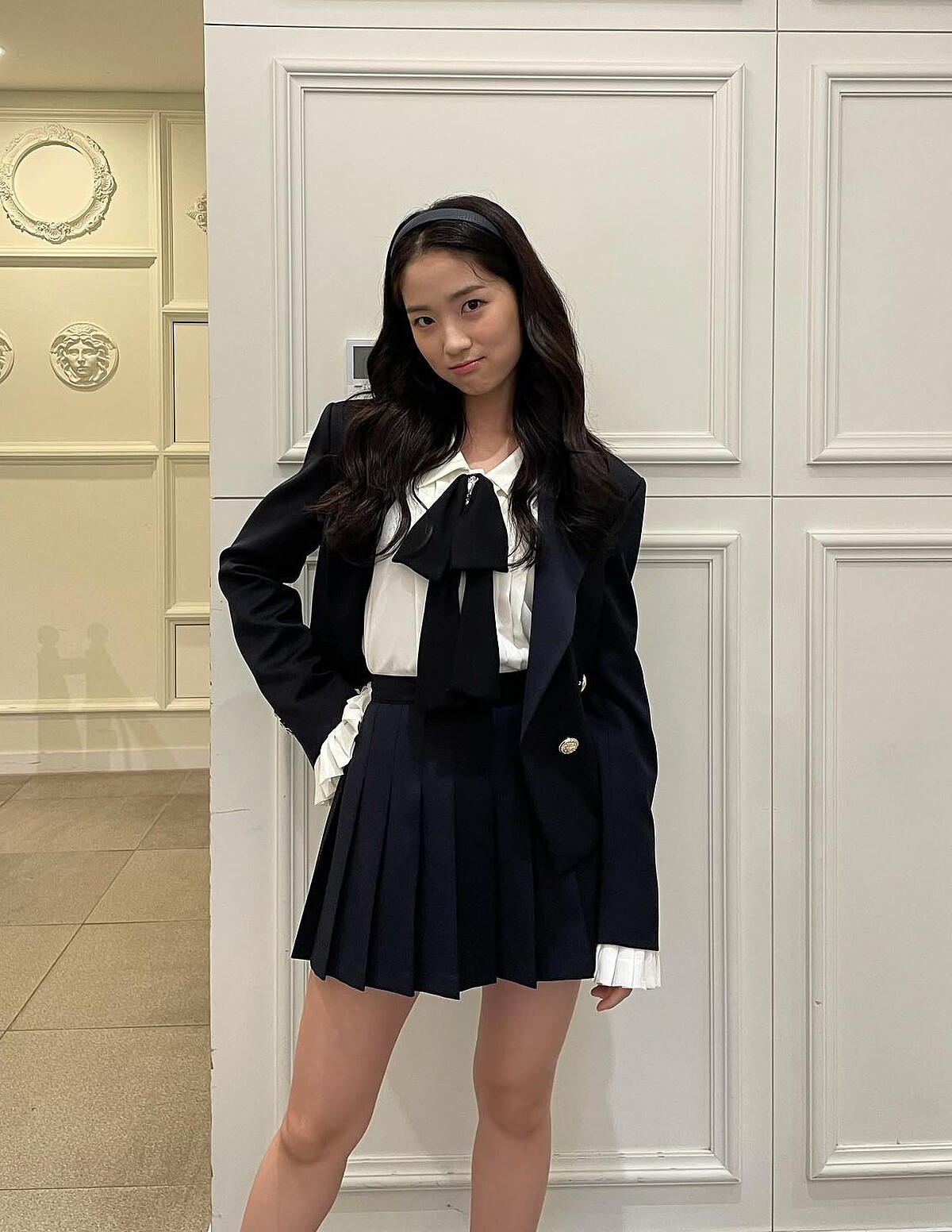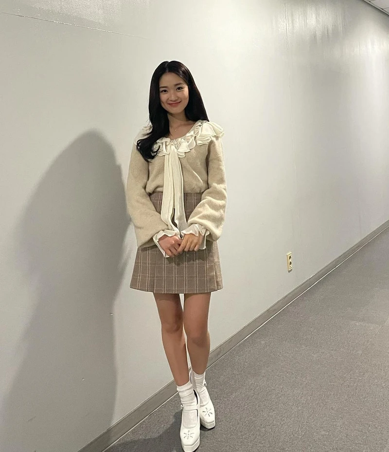 除了適合日常的橫條紋穿搭之外,金惠奫在帶點甜美的學院風氣穿搭上也蠻常見,比如說荷葉邊的領子和公主袖的上衣或者是蝴蝶結領帶與荷葉邊袖口,都是為穿搭加入甜美元素的重要細節,同時也可以學習金惠奫將可愛裝風格的上衣搭配中性感的單品,讓整體搭配乖巧卻不會顯的幼稚。
