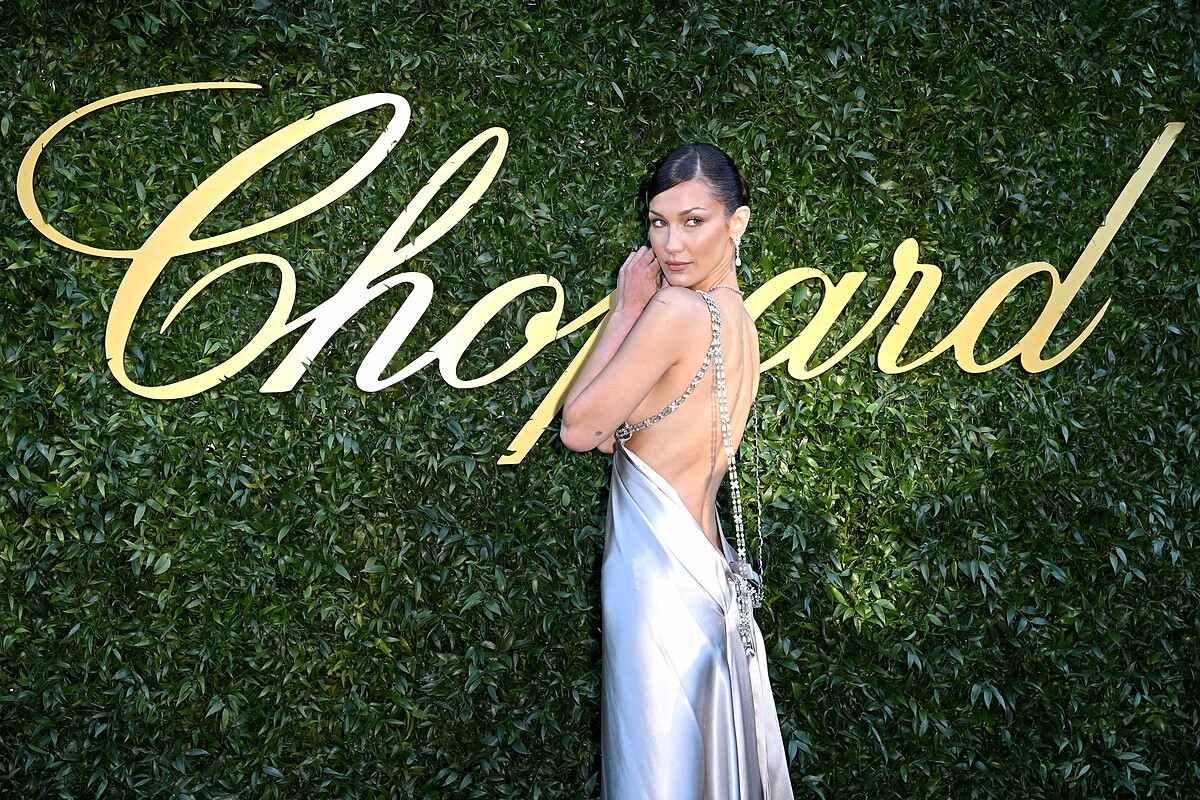 Bella Hadid出席蕭邦Chopard 舉行的ONCE UPON A TIME晚宴,當晚她換上與電影紅毯截然不同的典雅造型,身穿來自Dsquared2 2006年發表的Vintage禮服,銀藍色光澤的裙裝身後裸背設計高級而性感,垂墜的水鑽鍊帶連接腰際,與蕭邦的首飾珠寶相得益彰!腳下的銀色高跟鞋則是Giuseppe Zanotti 的設計。