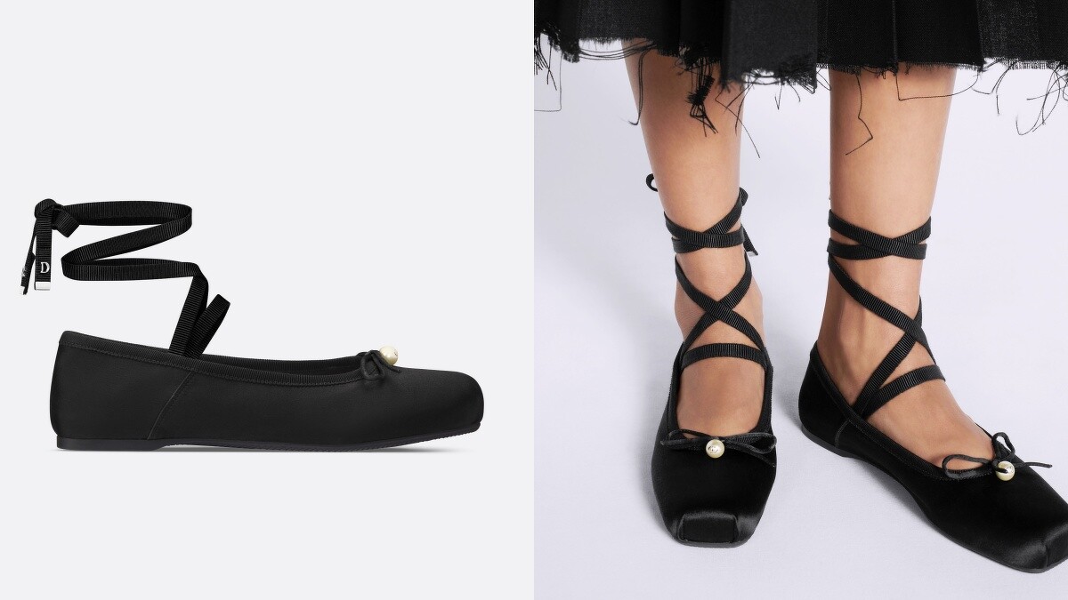 Dior這款黑色緞面D-Joy芭蕾平底鞋應該可以說是還原芭蕾舞鞋程度最高的鞋款之一,經典的方型鞋頭搭配鞋頭上的白色CD珍珠蝴蝶結,最特別的是可拆卸踝帶、軟式鞋後跟,讓這款鞋有多種穿法!