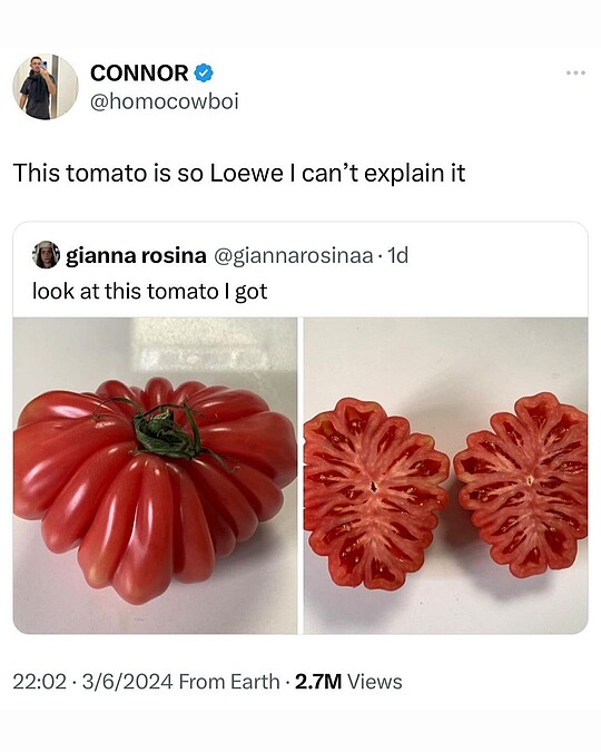 一名網友日前在X分享了自己找到的一顆特殊番茄,有著許多的皺褶,而這張番茄圖片被另一名網友轉發,並形容「This tomato is so Loewe I can’t explain it」(這番茄長得太Loewe了,我沒辦法解釋)結果這段評論成了一張迷因,在社群上不斷被轉傳,傳著傳著,Loewe創意總監Jonathan Anderson也看到了!他更把這張迷因發在Instagram上,與自己的粉絲們分享。