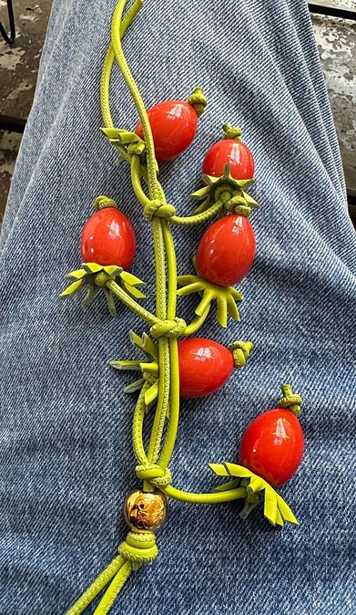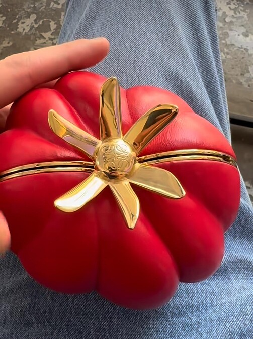 Jonathan Anderson親自轉發迷因後,下一則貼文竟然就是一顆嶄新的Loewe「番茄包」誕生了!從迷因化為現實,也不過1-2天的時間,所有粉絲們都對Jonathan Anderson創作的速度感到震驚與佩服,而這顆番茄包不僅還原了迷因番茄的皺褶,上方還運用Loewe Anagram製成蒂頭形狀的金屬鎖扣,擬真外型非常可愛,此外,他還加碼曝光另一個小番茄造型的皮革繩結。雖然無法確定Jonathan Anderson是否真的只用2天時間做出番茄包,或是原先剛好也有這樣的設計,但不管怎麼樣,這回的創作都特別有趣!
