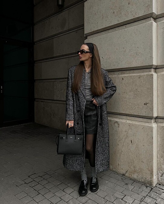 利用全身的灰黑色系來達到協調感,在大衣裡面搭配短裙或長褲都很俐落。選擇跟樂福鞋同顏色的墨鏡或貝雷帽這種配件,精緻度能夠大大加分。