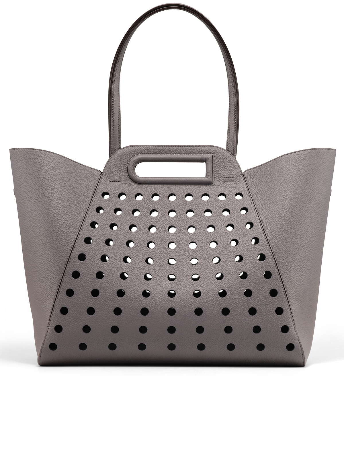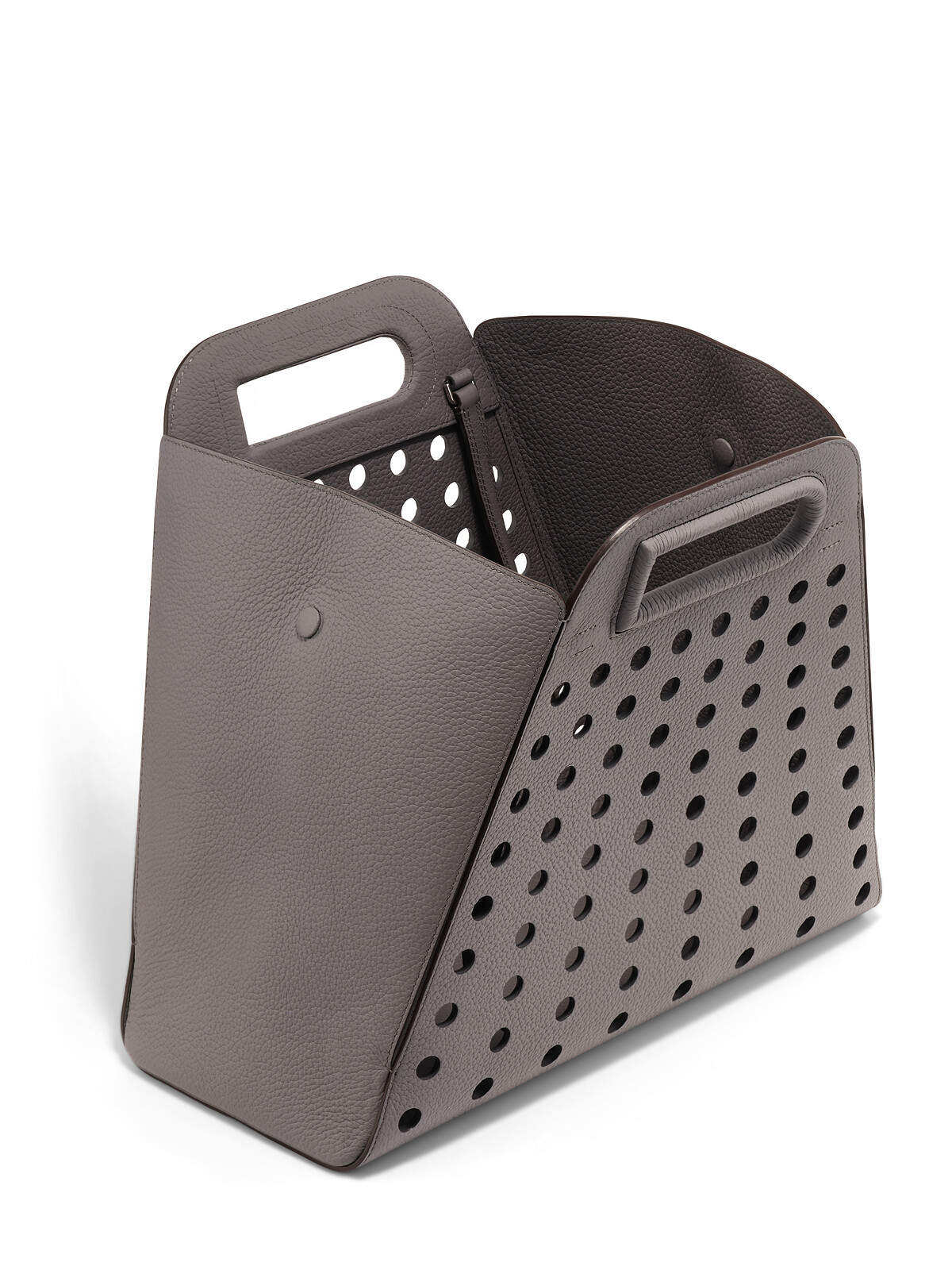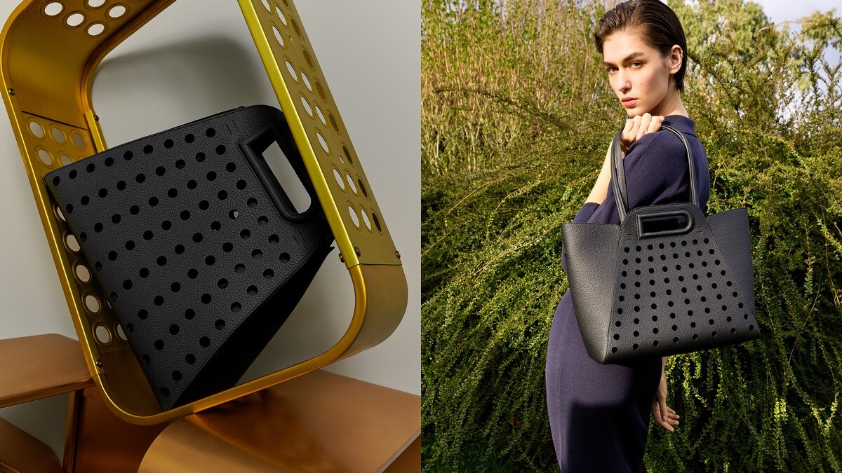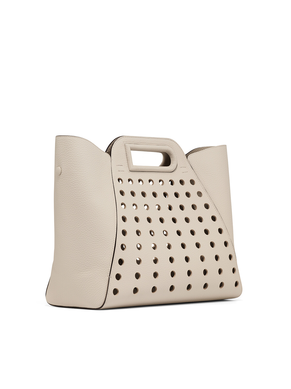 如同最初的Avia Airess行李箱,全新L'Airess包款上佈滿包身的圓形水刀切割孔洞,最主要的功用即是減輕重量、同時不影響使用。大尺寸的手袋若是使用全皮革面料,還沒裝多少東西就已經非常沉重,這是在許多品牌很常出現的情況。L'Airess使用堅固耐用的Taurillon小牛皮,打上孔洞後,讓你有更多扣打可以裝入物品,而不加重肩膀的負擔。