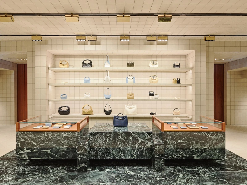 Bottega Veneta位於台北101購物中心的專門店,於2024年6月重新開幕為全新旗艦店!近百坪的展售空間內,囊括男、女裝、皮件、配飾、鞋履與香氛全品項,延續創意總監Matthieu Blazy在設計門市時鍾愛的現代主義風格,全店店裝由混凝土磁磚、義大利胡桃木和源自瓦萊達奧斯塔山谷的綠色勝丹尼斯大理石組成,大塊方形切割的牆面、家具,就像是在呼應Bottega Veneta經典的編織紋路,整間店逛起來很舒適,店中使用宛如冰磚造型的衣架、可旋轉的木頭飾品架,都是具有特色的小地方。