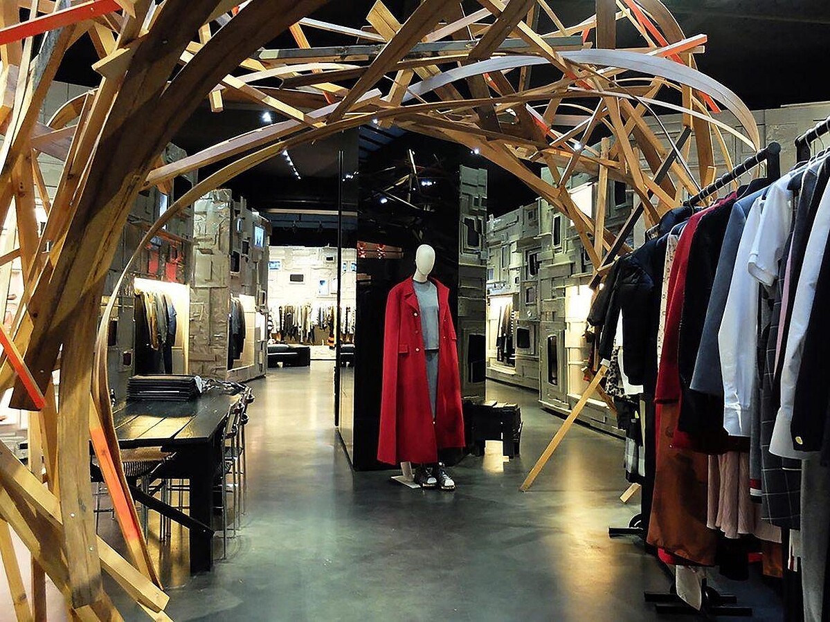 其中位於瑪黑區的LECLAIREUR Sévigné的店舖設計最具藝術色彩。店內除了有如樹木般的大型裝置藝術穿插在商品的陳列中,還有一面由比利時藝術家Arne Quinze製作的白色電視牆。藝術家將大小不一的螢幕鑲嵌在超過兩噸的厚木板上,當按下開關,牆面便會升起露出後面存放衣服的衣櫃。