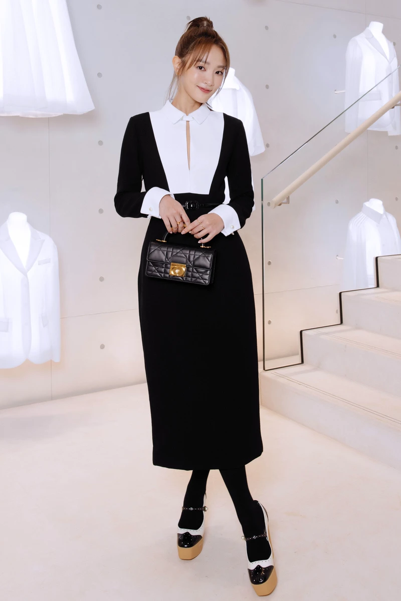 王淨這天收起平時的調皮,以一件高雅的黑白配色長洋裝展現優雅一面,手中的Dior Ange手袋為2024秋季全新款式,小巧包款配置的事大型的藤格紋絎縫,風格在女孩與女人之間能隨時轉換。