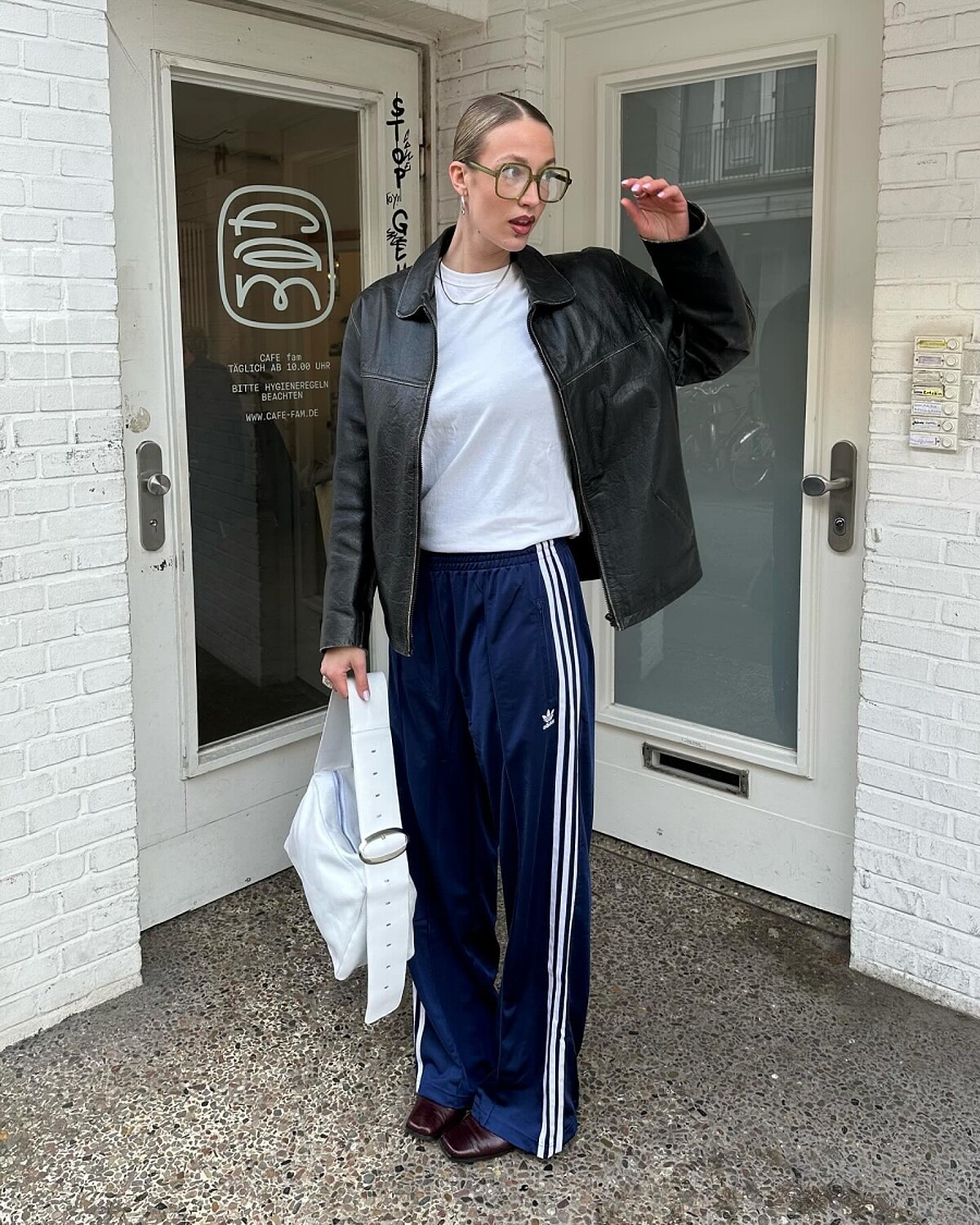 個性熟族的皮質外套搭配上運動長褲,以不會太會強勢的手法創造風格混搭感,但因為上下身風格都很明顯,內搭可以盡量簡單。以上10種不同的三線復古運動褲穿搭,推薦給大家試試看!