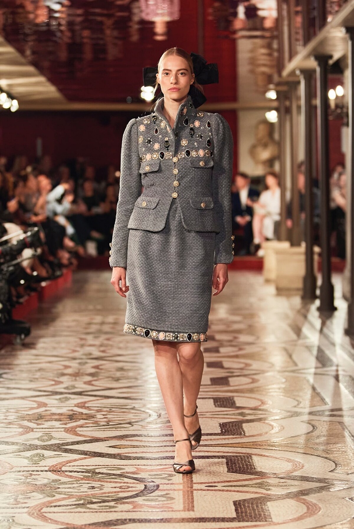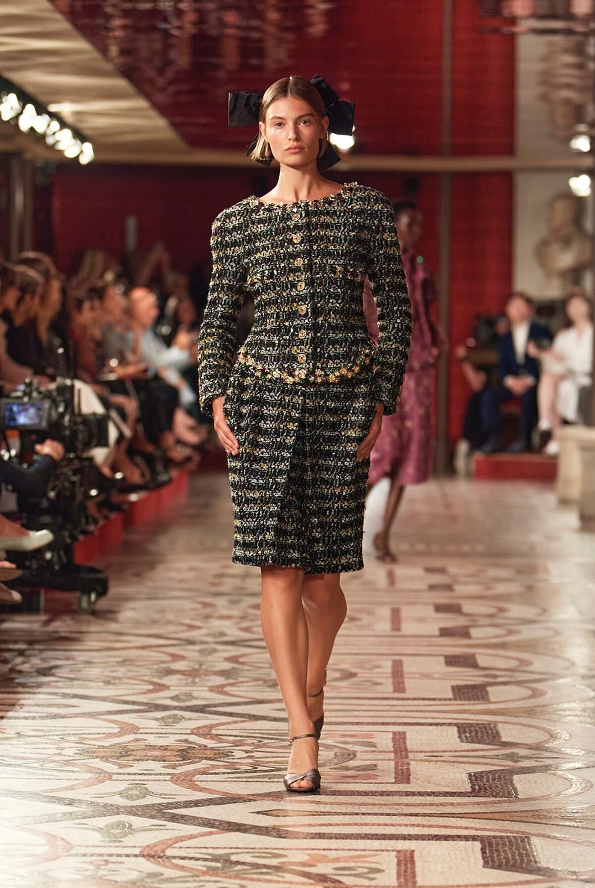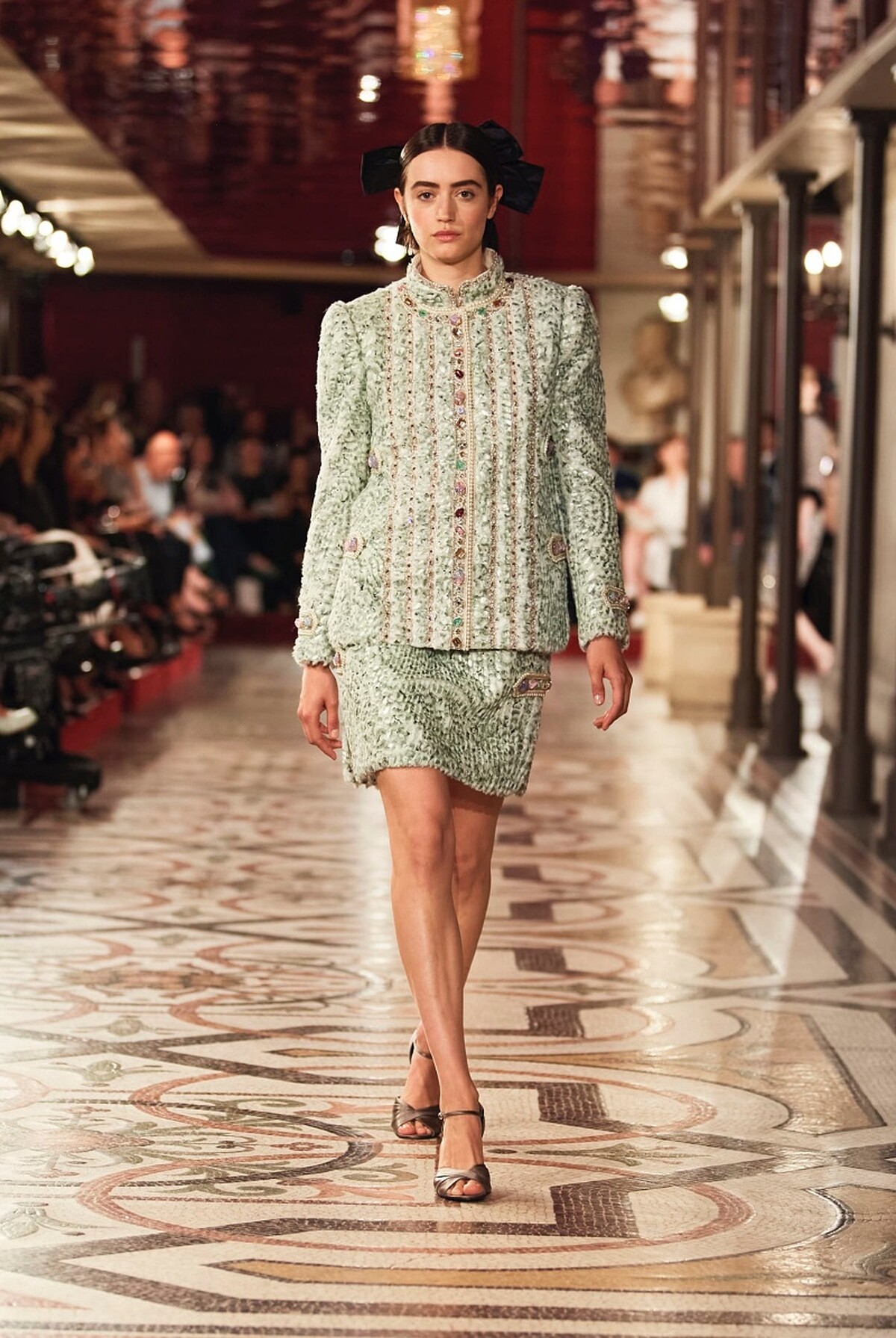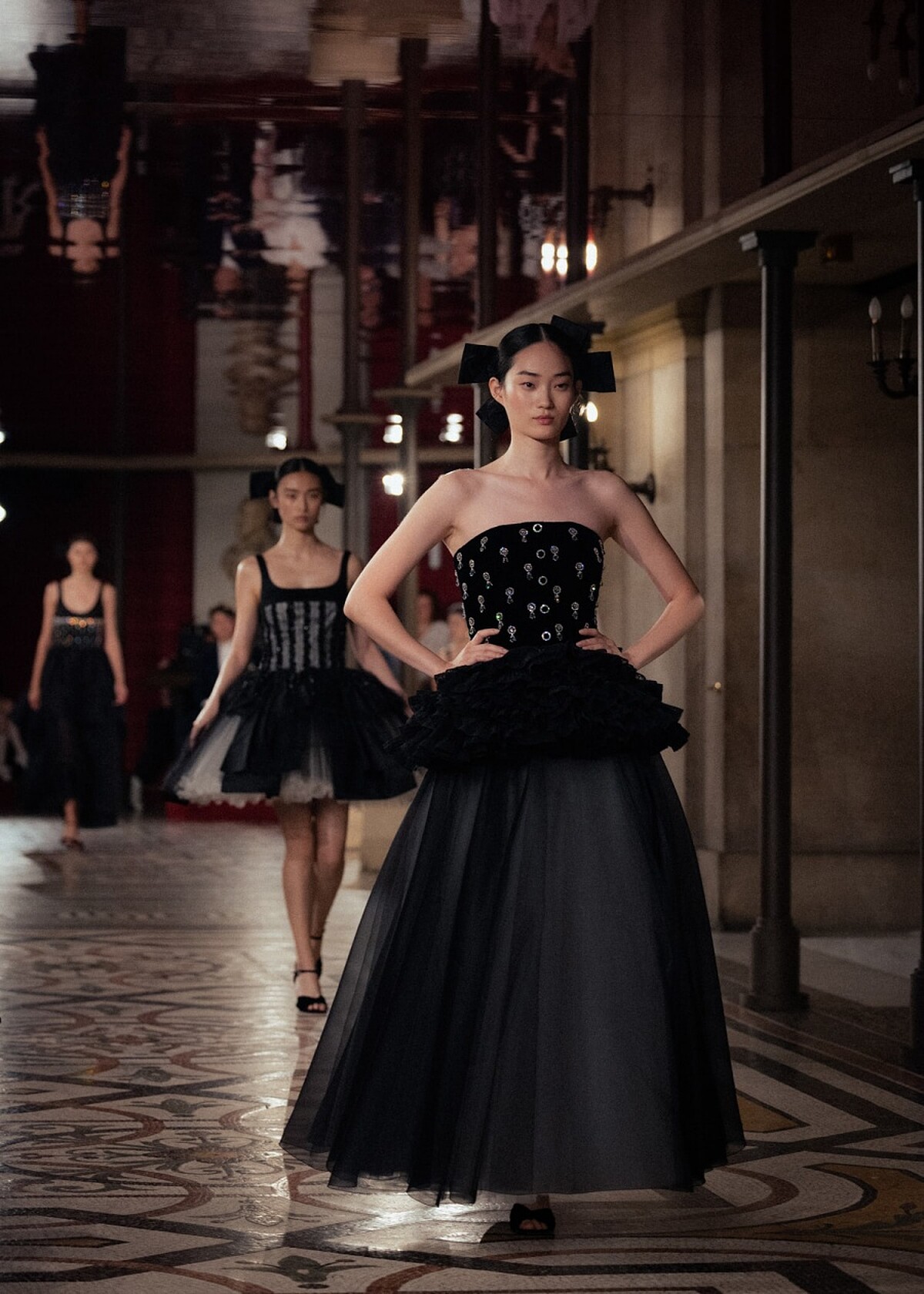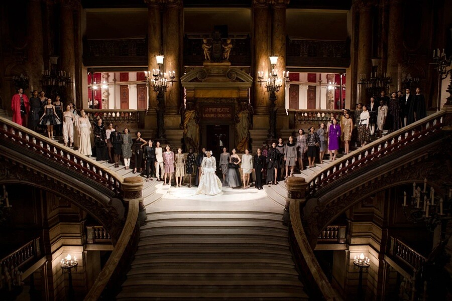 CHANEL 2024/25 秋冬高級訂製服系列,選址在巴黎歌劇院中舉行,這座在1875年落成華麗殿堂至今早已不只是法國著名地標,更是珍貴的歷史遺跡,而CHANEL選址於此則源自2018年,當時的CHANEL開始贊助巴黎芭蕾舞季開幕晚會,並在2021年以及2023年時,陸續成為巴黎歌劇院芭蕾舞團、巴黎歌劇院的主要贊助夥伴,如此深刻的淵源之下,這次高訂大秀便在環繞著劇院禮堂的外側走廊中展開,鋪上紅色絲絨的歌劇包廂的長廊中,搭陪法國導演克里斯多福·歐諾黑(Christophe Honoré)操刀設計的佈景之下,一場精彩絕倫的全新舞碼正式上演。