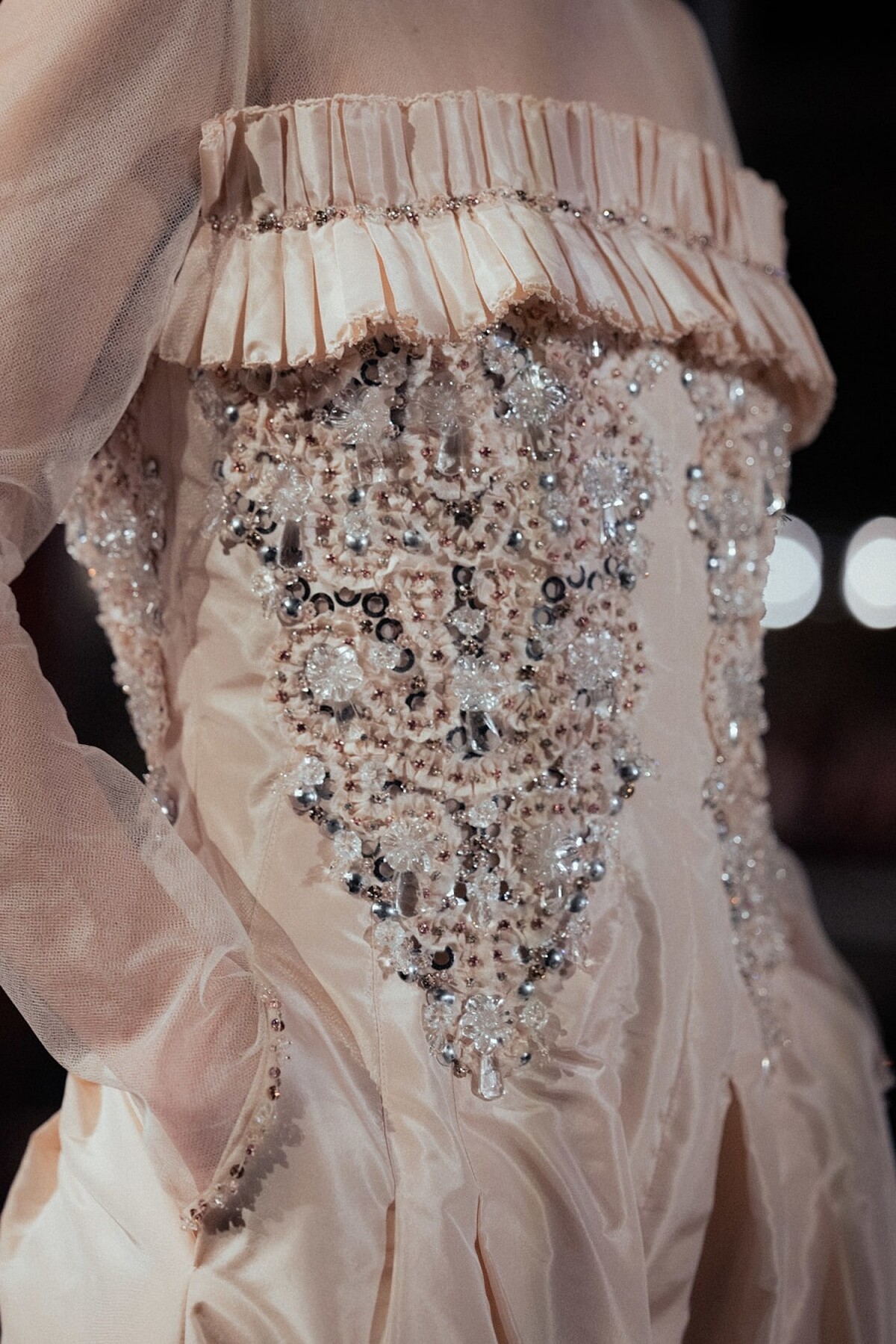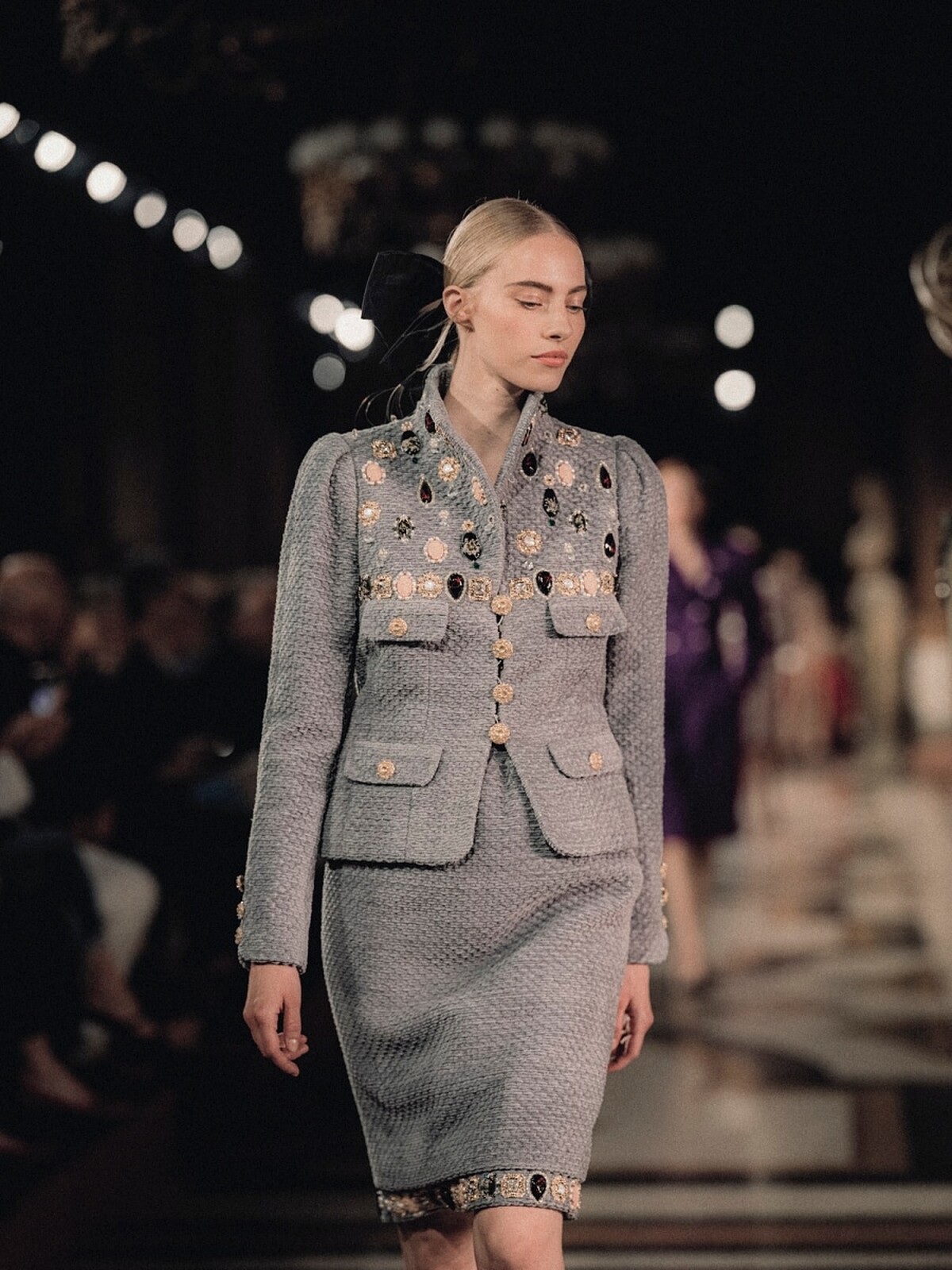本季的斜紋軟呢套裝、綢緞訂製服上,都以服飾珠寶以及花卉刺繡妝點,此外更有綢緞羽毛、流蘇的高級工藝的展現,如此華美的細節都是透過CHANEL康朋街31號的六間工坊,約150位工匠悉心打造,也在繼任的創意總監人選出爐前,以絕佳的工藝讓時尚界再次為CHANEL讚嘆。
