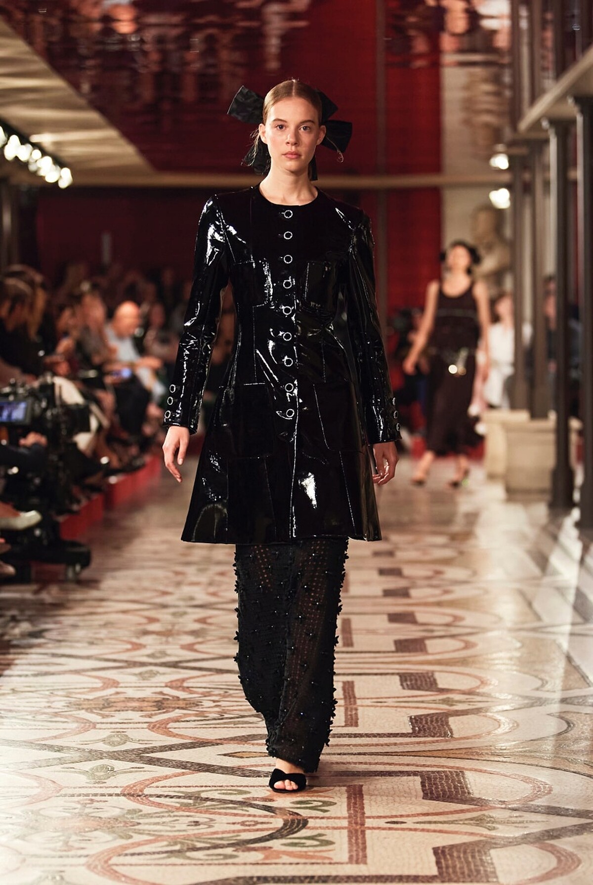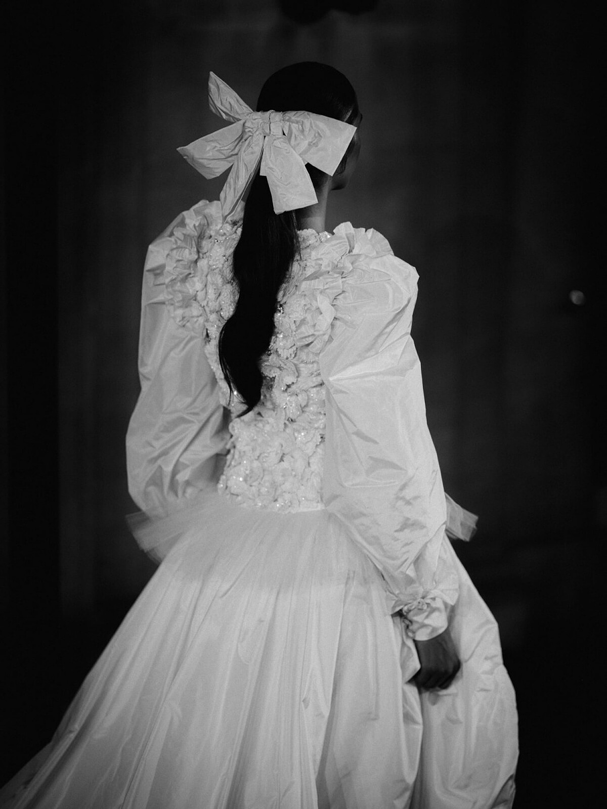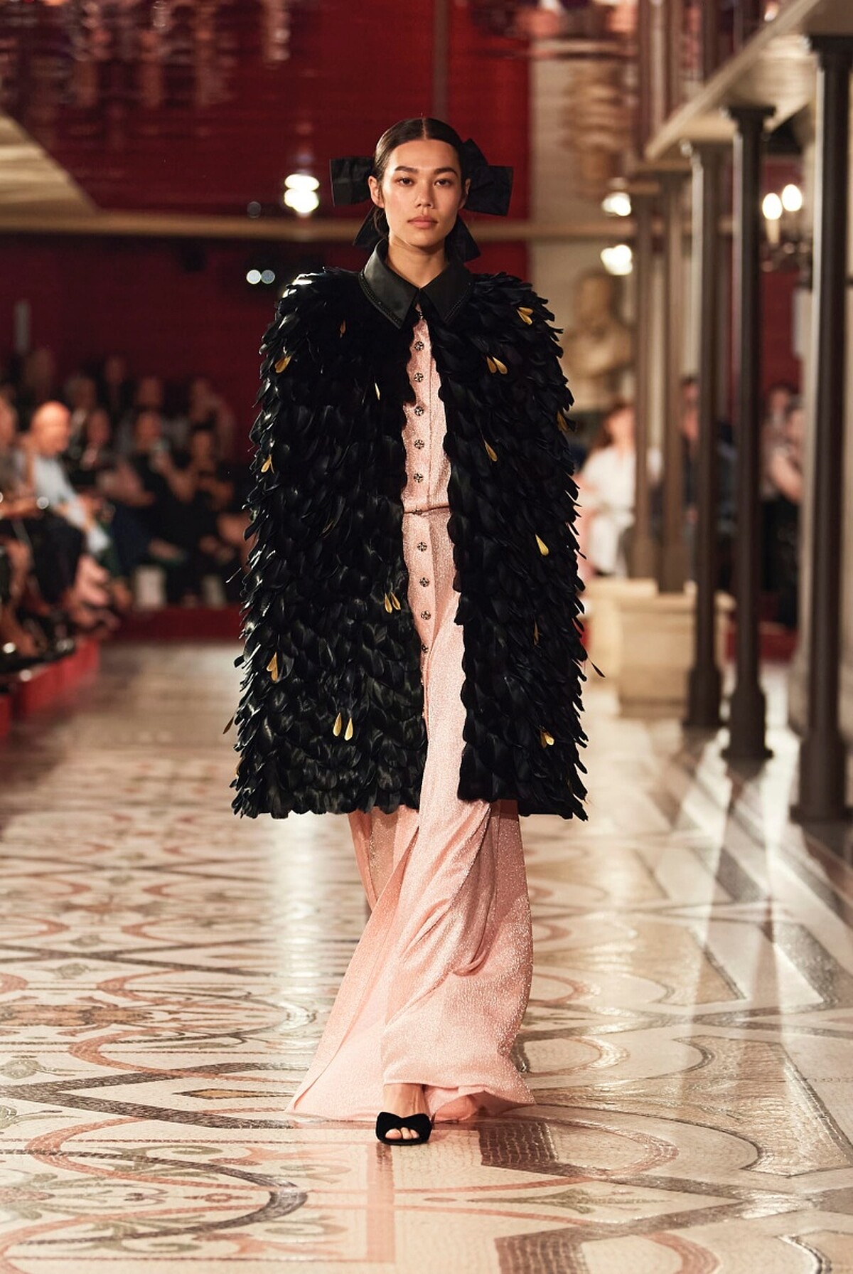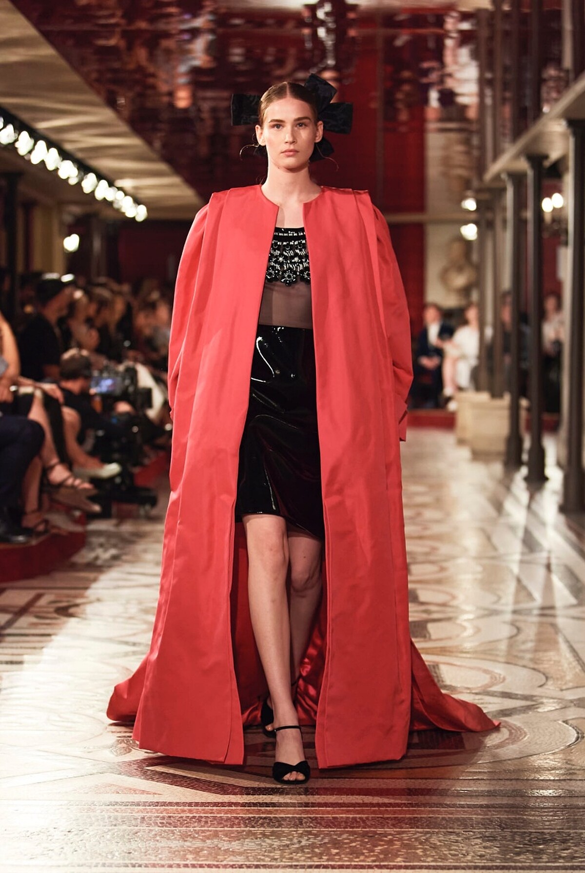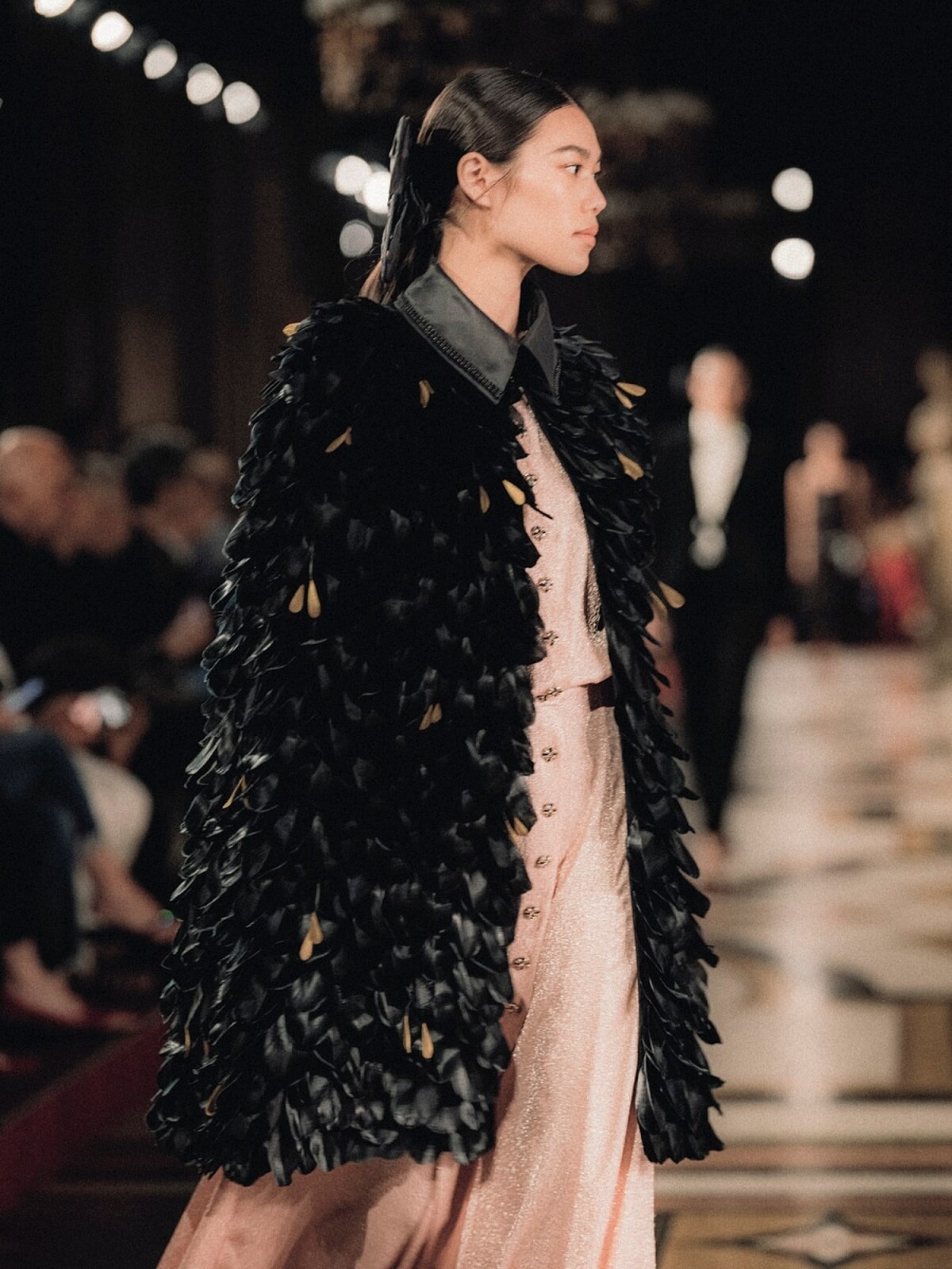其中這套由義大利超模Vittoria Ceretti演繹的黑色長版塔夫綢斗篷,將大氣優雅與強烈的戲劇張力演繹得幾近完美,更同時兼具份量感與輕盈視覺,為這場高訂大秀走出氣勢強勁的開場。