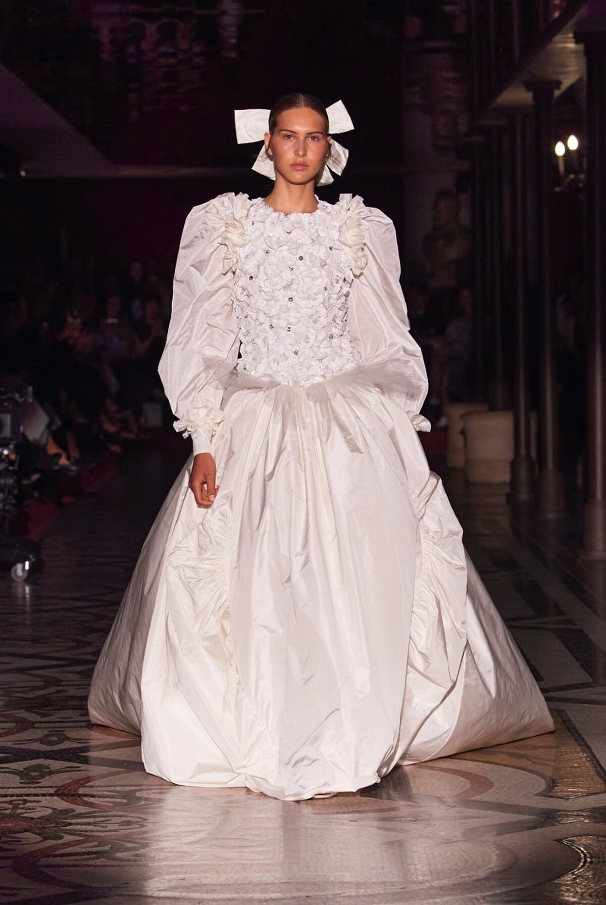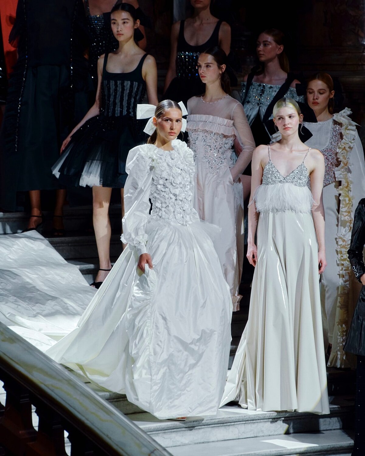 每一季的CHANEL高訂重頭戲,就是秀上壓軸的婚紗系列,能穿上壓軸婚紗閉秀的模特兒也都非等閒之人,本季就由澳洲超模Angelina Kendall以一襲純白塔夫綢搭配古典泡泡袖與大量荷葉邊褶飾設計的禮服,為這場盛典閉幕。