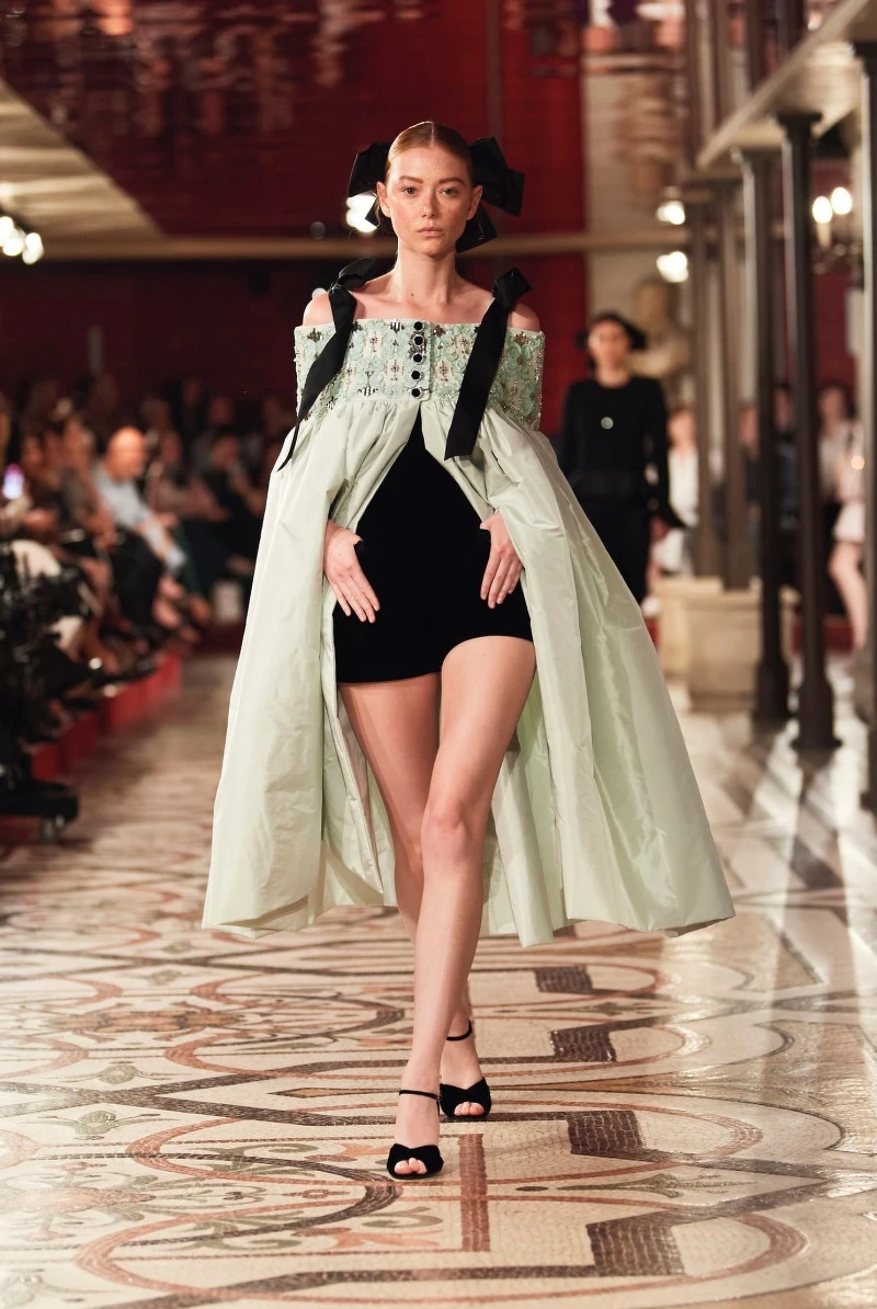 其中這套由義大利超模Vittoria Ceretti演繹的黑色長版塔夫綢斗篷,將大氣優雅與強烈的戲劇張力演繹得幾近完美,更同時兼具份量感與輕盈視覺,為這場高訂大秀走出氣勢強勁的開場。