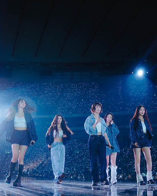 HAERIN 的造型是穿上有著經典圖案的水晶丹寧夾克,搭配淺色丹寧短褲與白色內衣登場。HYEIN 則穿著 Calvin Klein 經典標誌圖案並有著水晶設計的寬鬆靛藍色丹寧外套亮相。團員整體的色調與造型一致,展現屬於 NewJeans 的風格魅力!