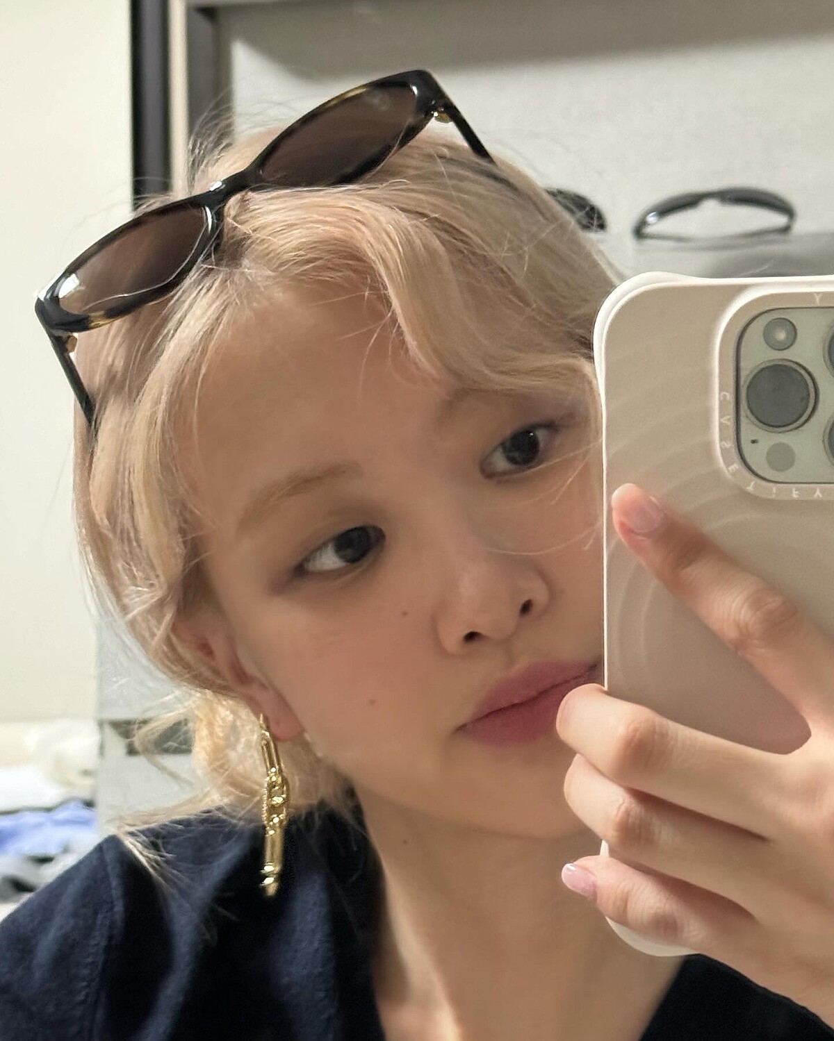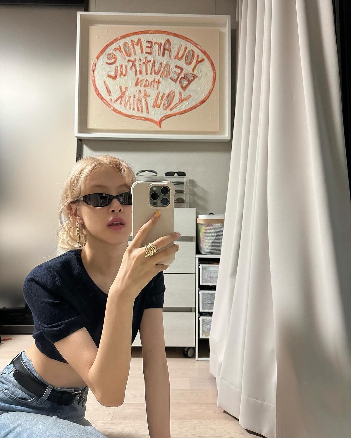 Rosé輕鬆的在家對境自拍照中,身穿深藍色的短版T恤和牛仔褲,露出小蠻腰,搭配上的是SAINT LAURENT的扁框墨鏡,非常符合他颯爽的個人特色。