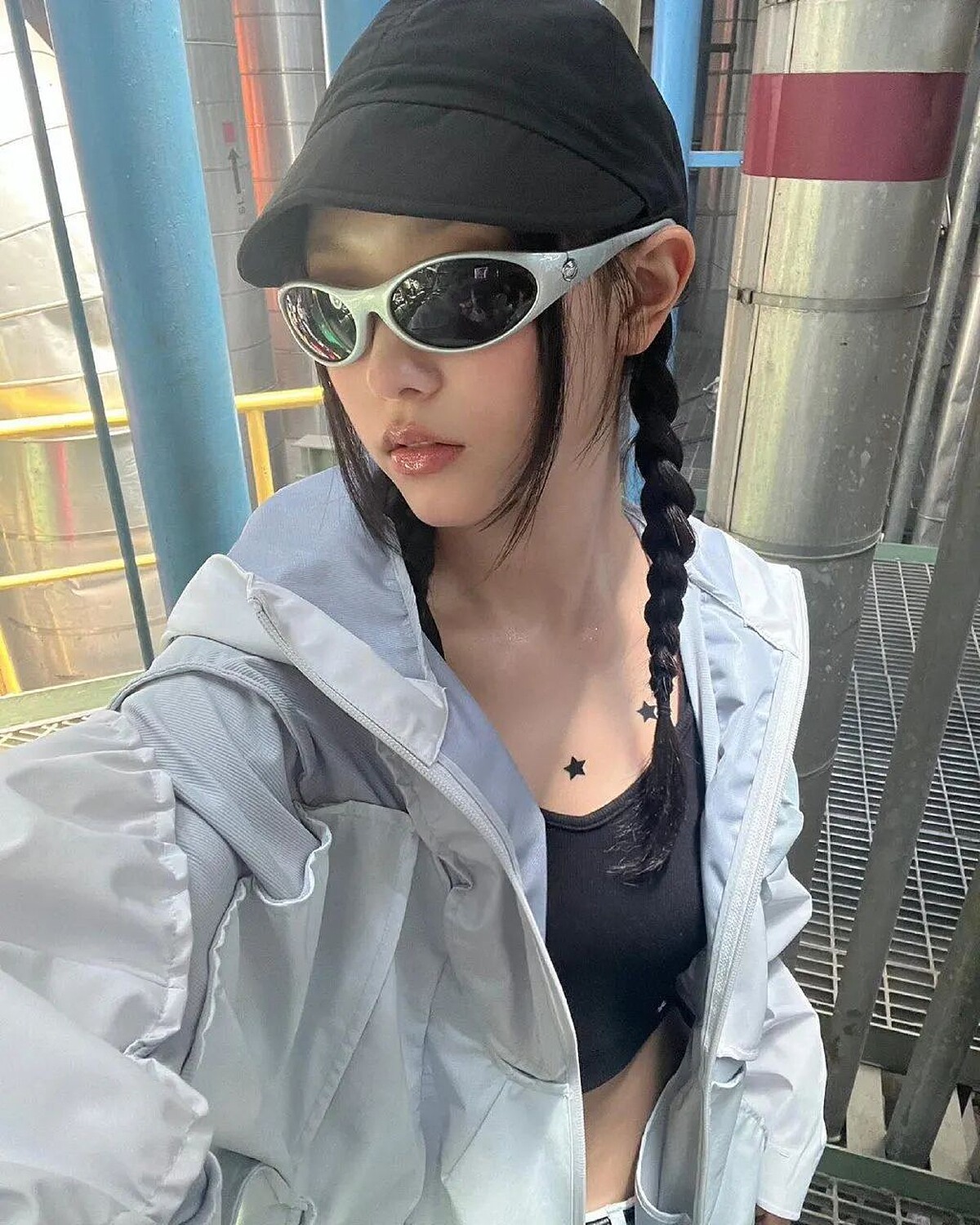 NEWJEANS的成員Haerin,以黑色運動內衣搭配灰色運動外套的時髦Y2K造型,搭配銀色金屬感太陽眼鏡,綁著麻花辮,前衛又可愛的風格立刻完成!