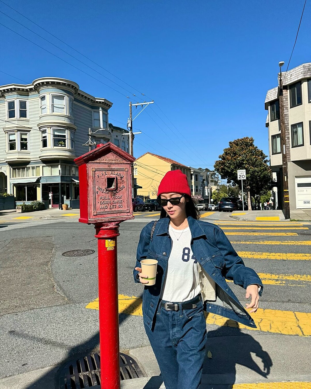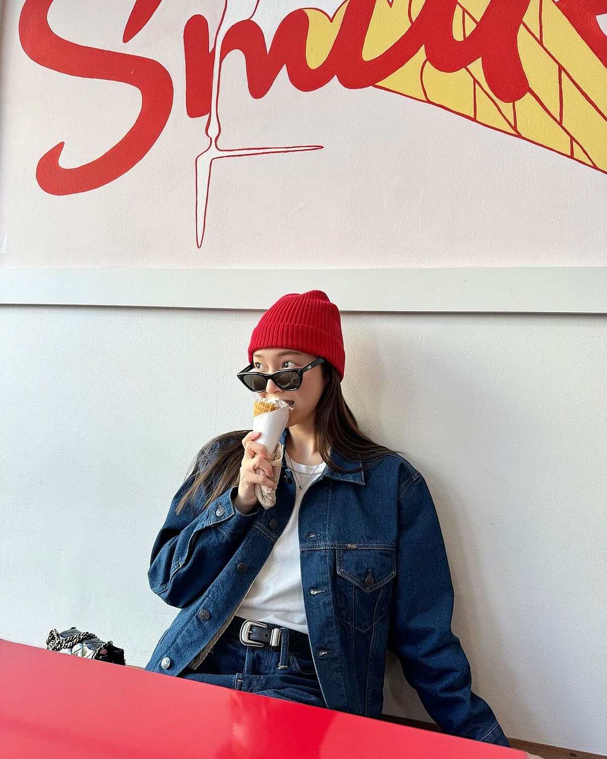 Jessica身穿帥氣的牛仔襯衫外套和牛仔褲搭配上白色T恤,利用紅色毛帽,熱穿搭展現對比感,搭配上Gentle Monster貓眼墨鏡,為美式風格加入了俐落的造型感。