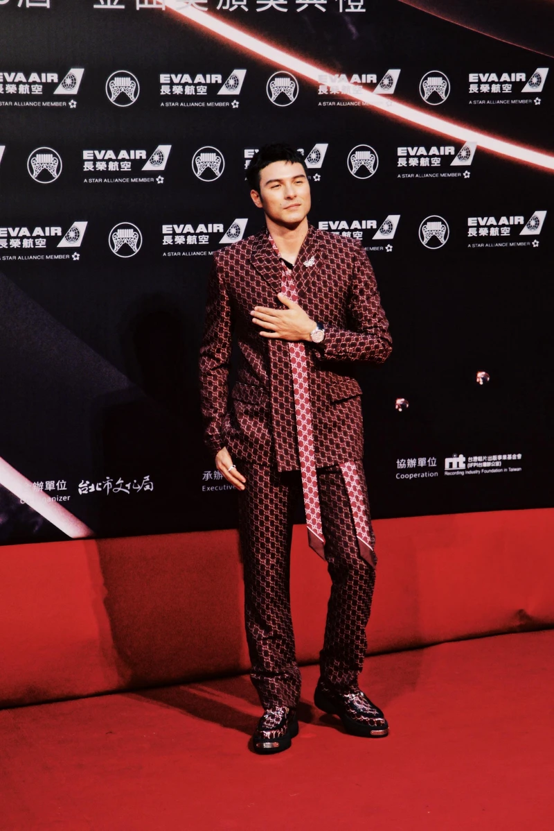 入圍【年度專輯獎】、【最佳原住民語專輯獎】的AZ 李孝祖,以一身黃黑相間狂野虎紋西裝踩上紅毯,成為今晚紅毯上的亮眼造型。