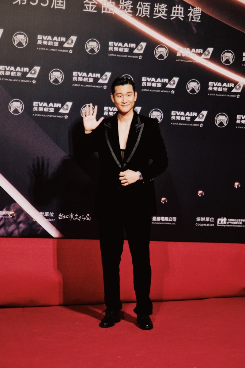 雖然也是選擇了黑色系的造型亮相,但周興哲選擇了Tom Ford的深V天鵝絨西裝搭配緞面飾邊,內搭是透膚的網紗低領上衣,搭配結實的胸肌線條,也是今晚紅毯上的性感亮點。