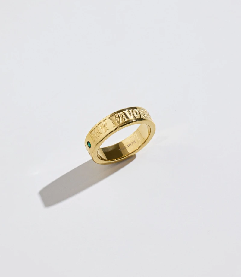 有MY FAVORITE標語字樣搭配上祖母綠誕生石的戒指,設計有特色搭配度也高。