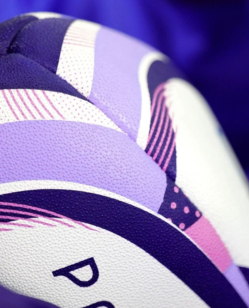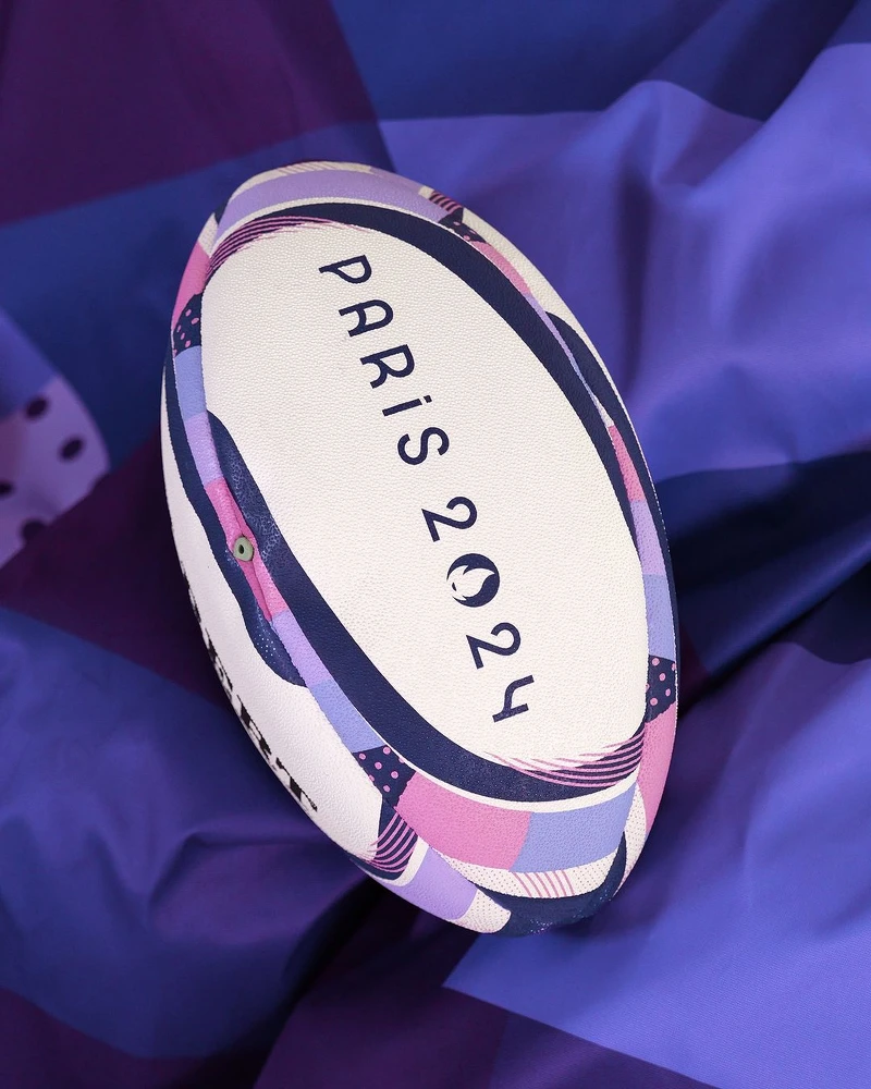 2024巴黎奧運的球類比賽使用球具,外觀也經過重新設計,橄欖球上再次體現主視覺的配色,以紫色調搭配粉嫩色系,用環狀線條與分割色塊,呼應橄欖球的橢圓形狀,近看細節是不是很美?