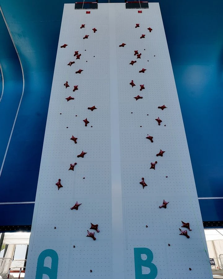 2424巴黎奧運的攀岩項目運動場地同樣延續主視覺的配色,清新湖水藍綠色調以粉色點綴,再分區裝上不同顏色的岩塊,不規則形狀的排列、分布,讓整體看起來頗有藝術感!目前場地已經過專業測試,將會於8月5日迎來首個攀岩項目賽事。