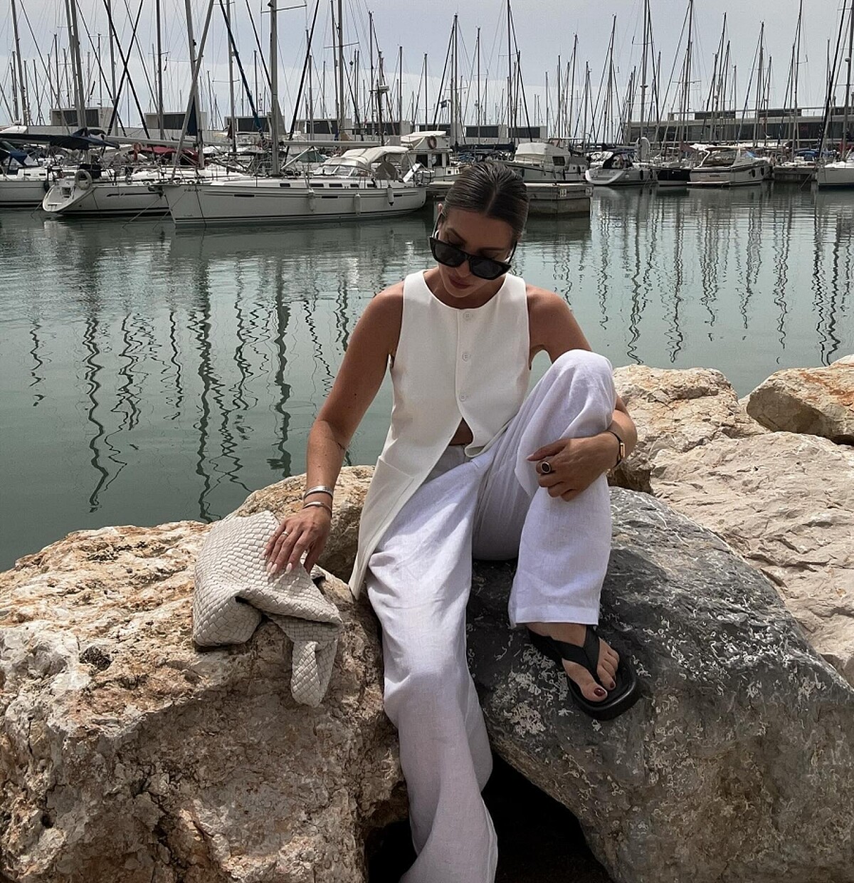 這樣的造型在日漸高溫的夏季之時,也成為許多歐美時尚穿搭博主們的鞋履選擇之一,在西裝褲、連身裙等穿搭中都能看到穿著人字拖鞋的造型。如果想避免造型太過隨意,腳趾上個指甲油,或腳鏈、腳趾環都會讓造型更完整!
