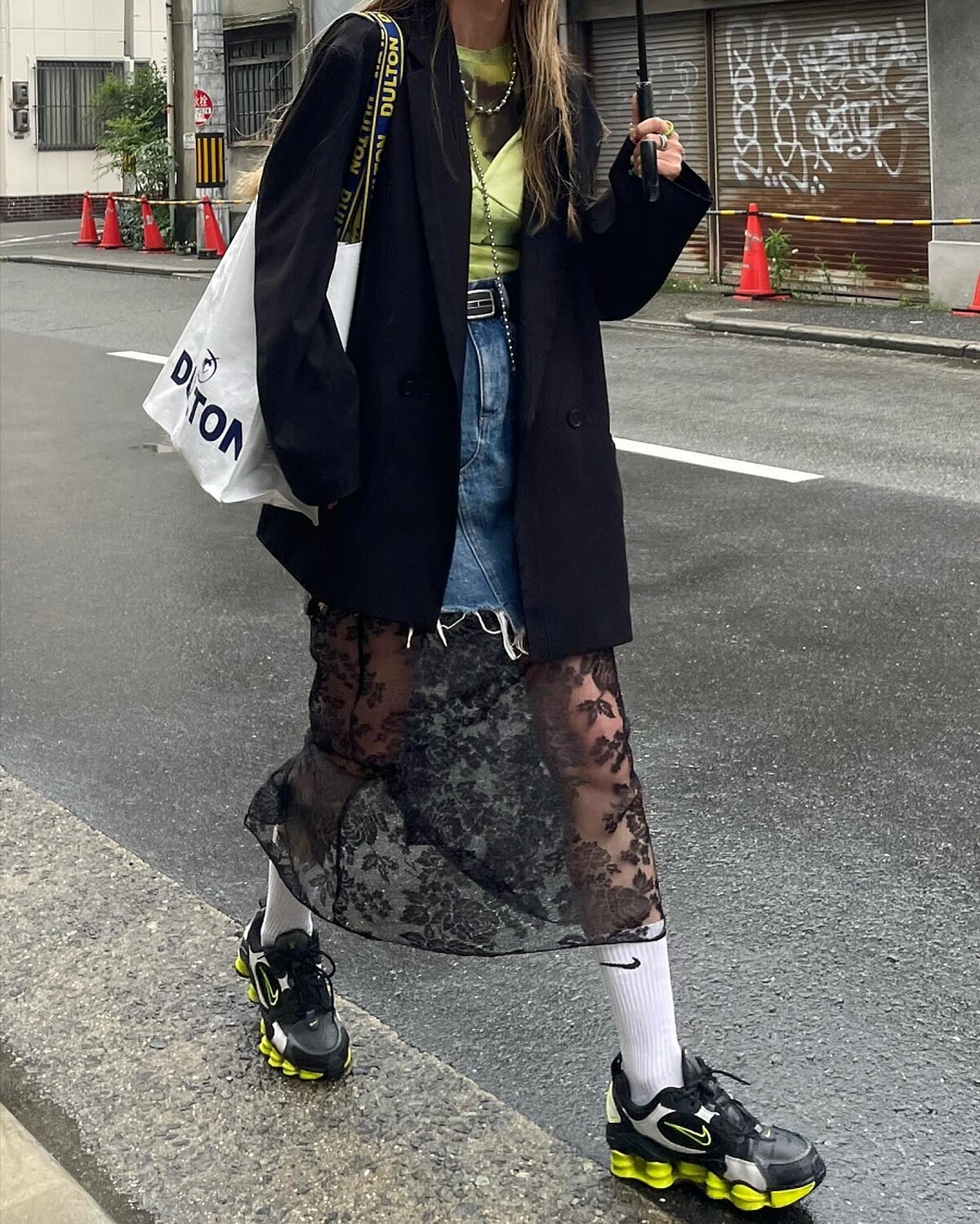 在強調透明感的夏季穿搭中,從2023年開始就成為時尚博主穿搭中不可或缺的Alaïa漁網鞋再度重回熱門單品中,在超模Elsa Hosk的穿搭中也時常可以看到,在今年除了大格的漁網鞋之外,質感更細膩優雅的網紗鞋也後勢看漲,在Rosé的穿搭中也曾出現過一雙Khaite水晶網紗鞋。除了單穿之外,還可以運用鞋款的透視感,搭配上彩色襪子,讓鞋款展現不同的造型面貌。
