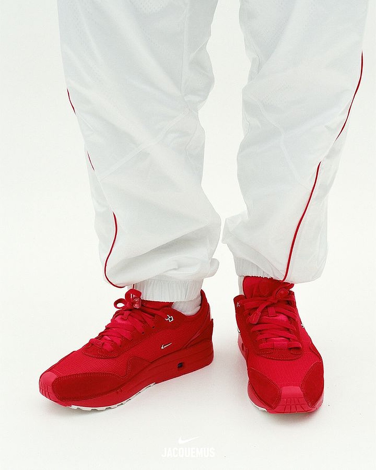 這回改造的是Nike經典的Air Max 1鞋款,鞋身飾有迷你金屬 Swoosh Logo, 全紅款式為網布面料、白色款式則是以皮革加入透氣孔洞,與麂皮拼接而成,鞋舌上左、右腳分別裝飾方形和圓形的皮標,鞋底紋路也是左右腳不一樣的!這是屬於Jacquemus的經典設計巧思。