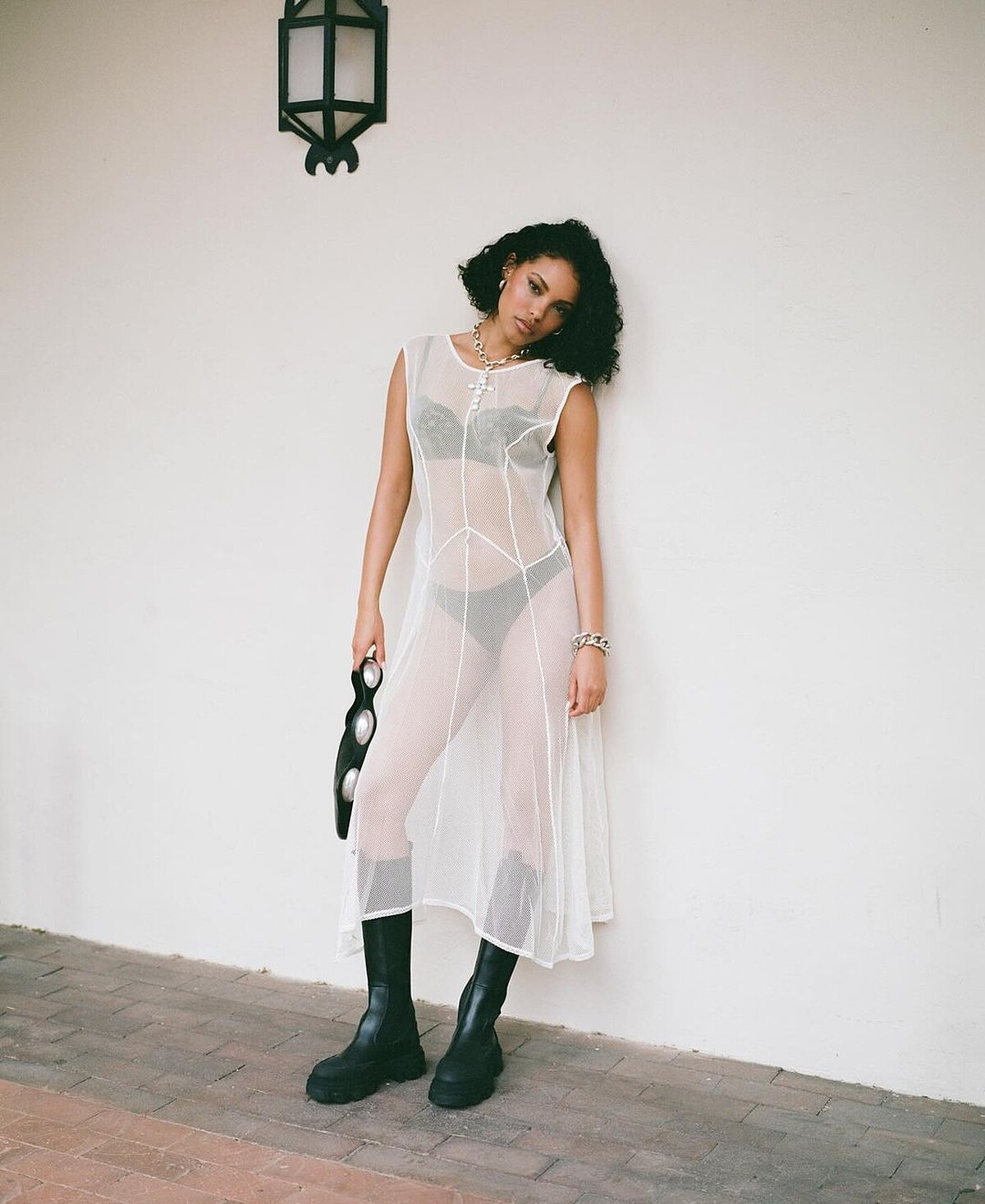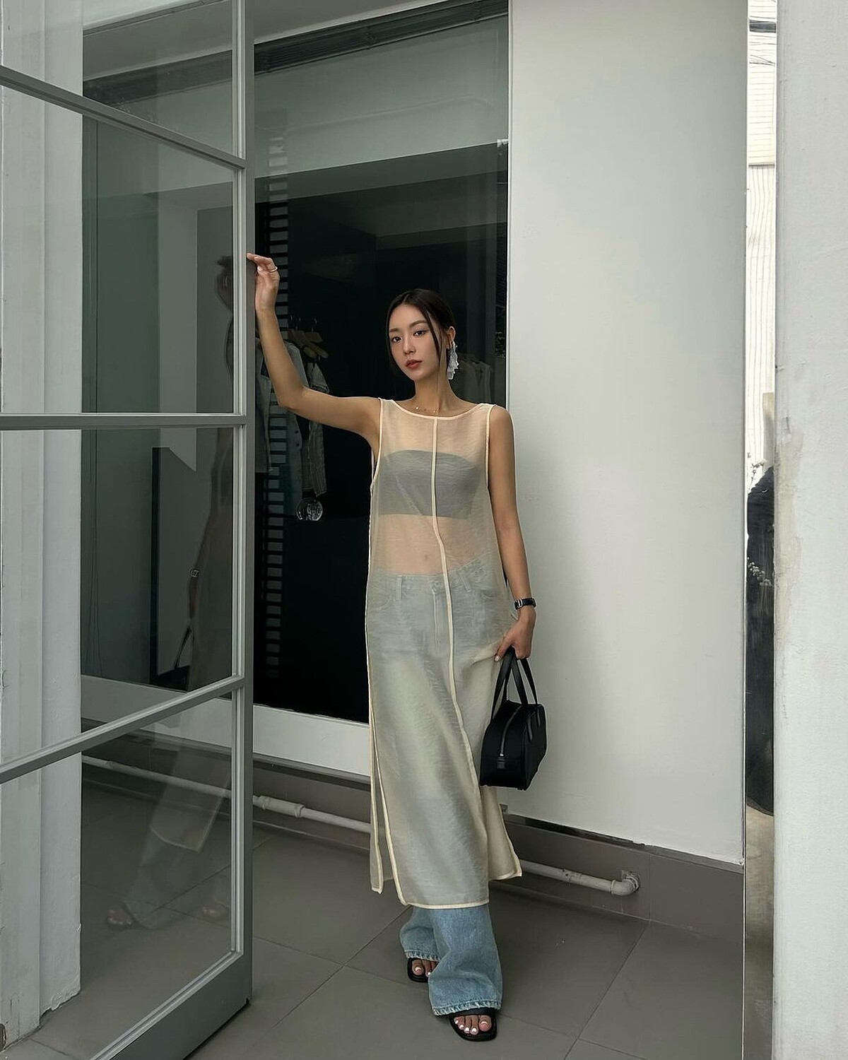 怕薄紗洋裝太曝露嗎?可以試試在裡面穿抹胸內衣搭配牛仔褲。這樣既能保留透視效果的神秘感,又感覺非常舒適自在。如果想要增添一點運動風,可以換成運動內衣和運動鞋搭配。