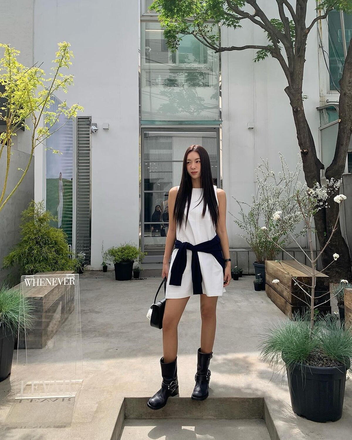 穿上簡單的白色短版洋裝,如果想要顯瘦可以在腰間綁上一件外套,還可以增加層次感。利用皮靴、手提包配件行成全身的黑白對比,帥氣感十足。