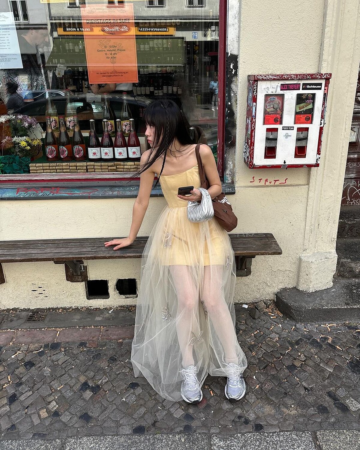 奶油黃色的薄紗洋裝既有少女的夢幻感,又有薄紗的透視效果。搭配上一雙小白鞋,就可以營造出休閒的浪漫感。