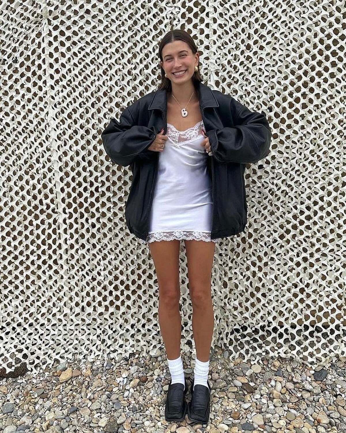 不敢把絲綢蕾絲洋裝穿出門嗎?可以試試搭配皮夾克和樂福鞋。這樣既可以讓裙子的睡衣感不這麼重,又可以同時大方展現性感。