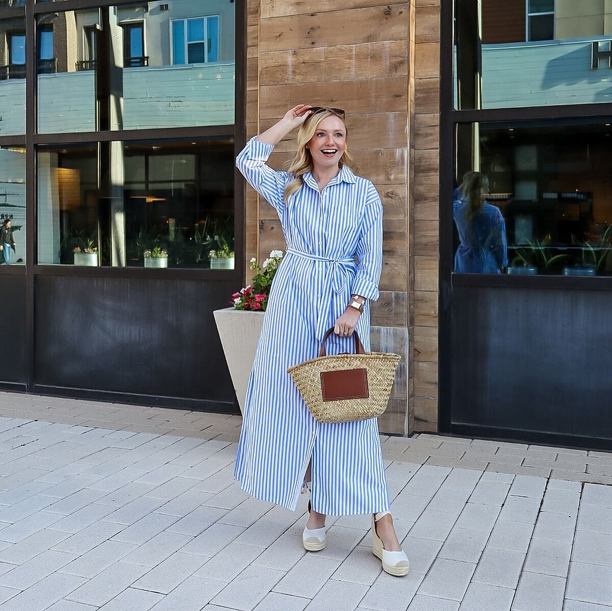 這件藍白條紋的襯衫式洋裝顏色清爽,很適合夏天氣氛。配上草編包和厚底涼鞋,立刻增添了鄉村風情。想再添一點味道的話,可以試試戴上草帽。